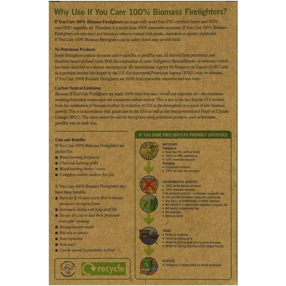 - If You Care Firelighters are environmentally friendly fire starting cubes made from wood and vegetable oil. Can be used with charcoal burning grills, wood burning stoves and ovens, wood burning fireplaces and campfires and/or outdoor fire pits.