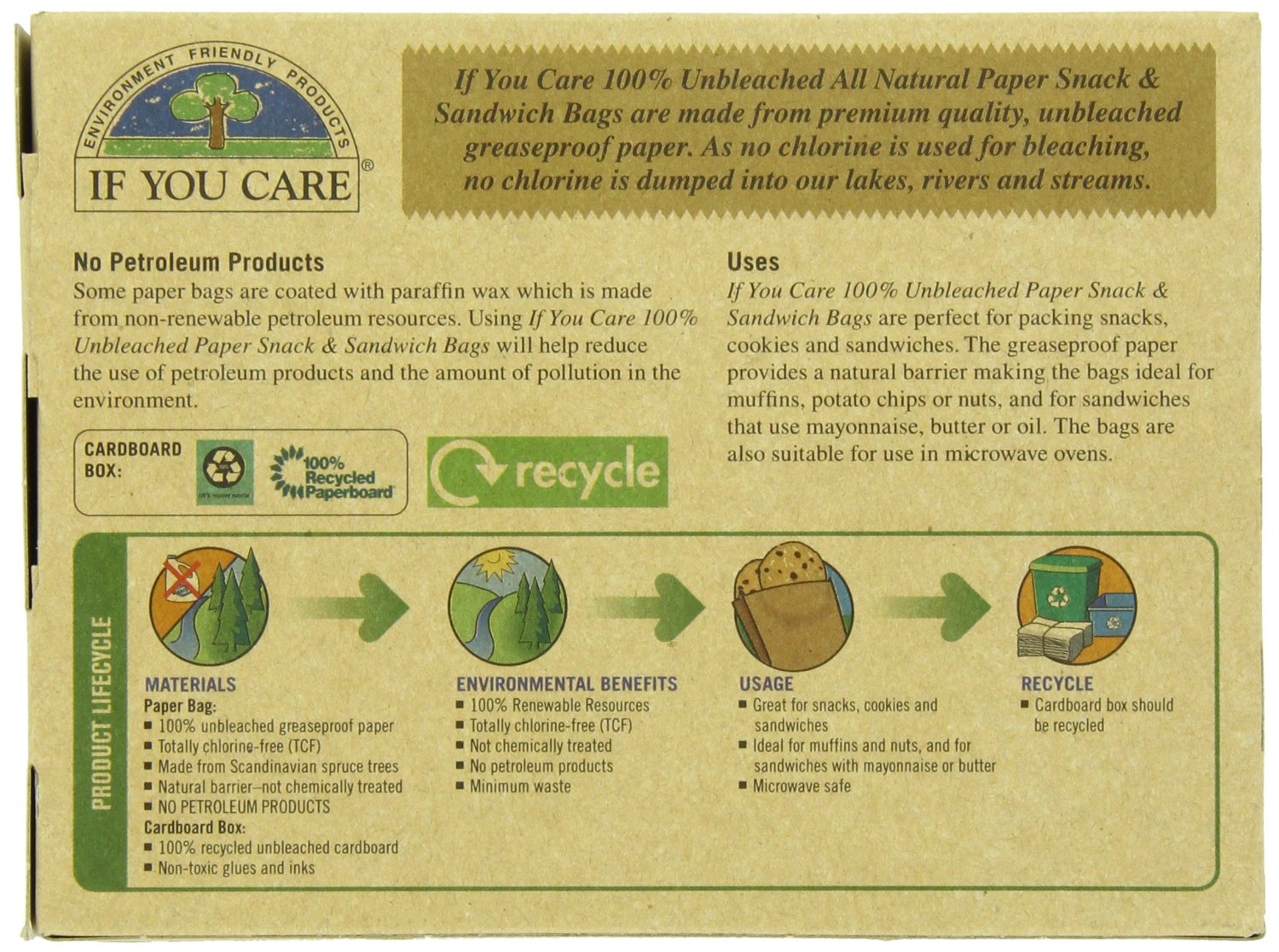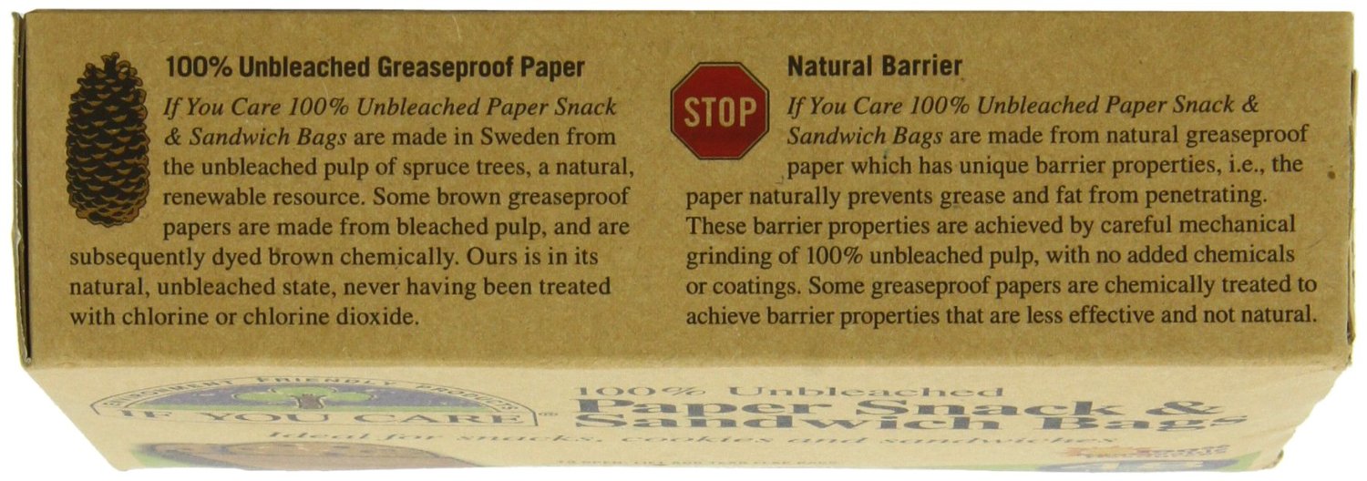 If You Care Paper Snack and Sandwich Bags is made from unbleached pulp of Scandinavian spruce trees, a natural and renewable resource. They are greaseproof and provide a natural barrier making the bags ideal for nuts, potato chips, cookies and sandwiches that use butter, mayonnaise or oil. The bags are also suitable for use in the microwave. If You Care Sandwich Bags are uncoated, they are not treated with petroleum-based paraffin wax, soy or any other type of wax. These snack and sandwich bags are totally chlorine-free.
