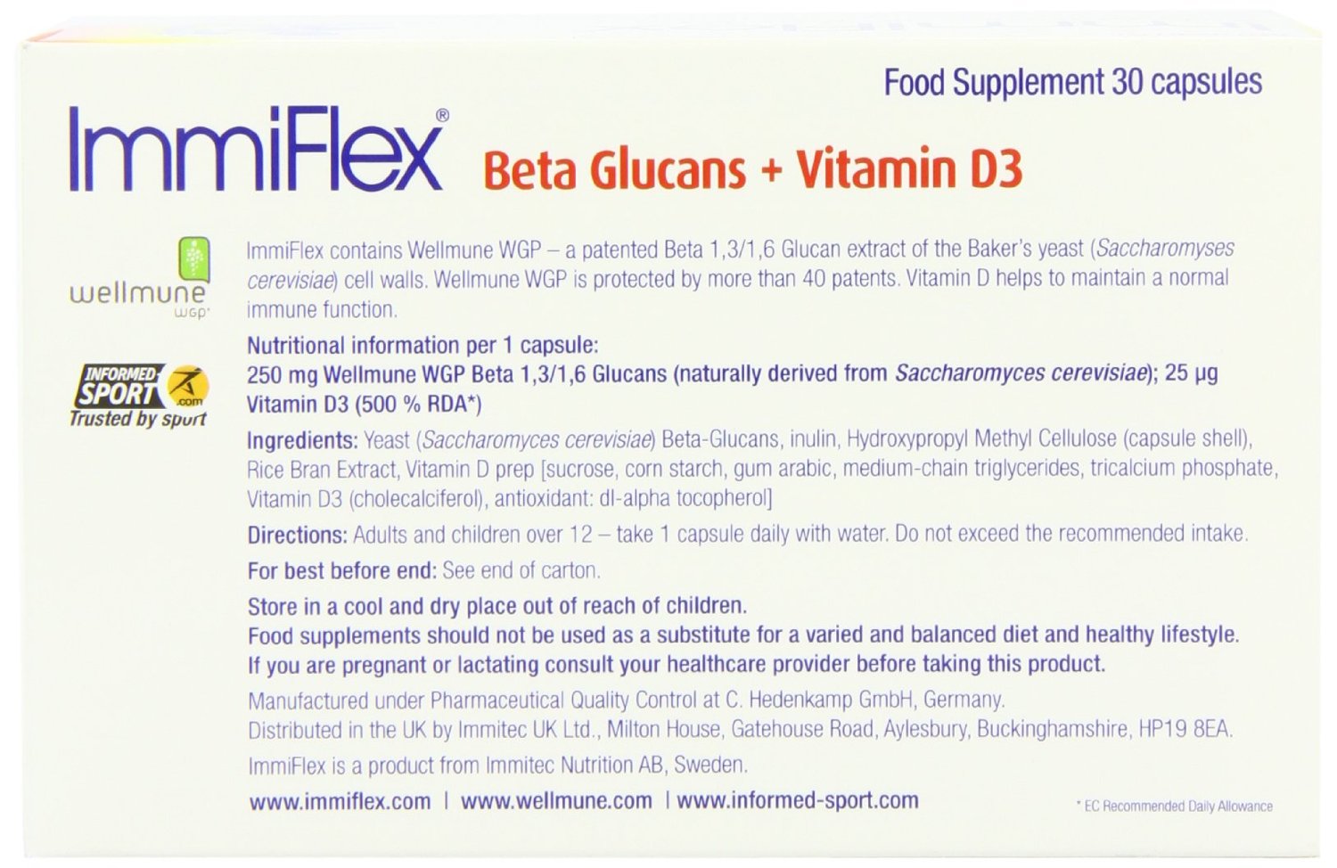 ImmiFlex Betaglucan plus Vitamin Capsule is a one-a-day immune formula for those who want to prevent and reduce the symptoms of infection, upper recommended beneficial dose for some health challenges is 4 capsules per day. Benefits Clinical trials prove the benefits, safety and efficacy of Wellmune WGP in priming the innate immune system, thereby aiding the body to fight pathogens including cold and flu viruses and to fight infection. Each pack contain 90 capsules.