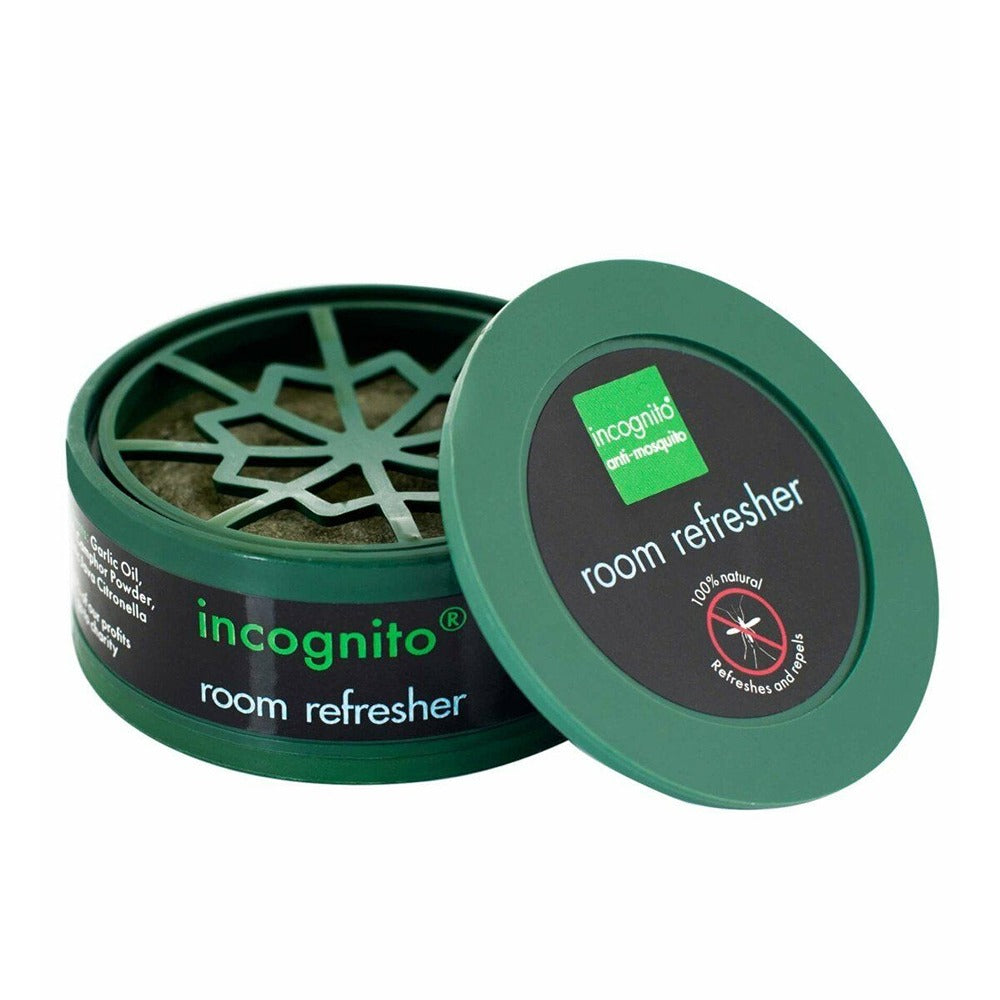 The Incognito Room Refresher will keep insects out your room for up to 6 weeks by simply removing the lid. This 100% natural insect repellent works on all insects, is DEET free and is effective for 3 weeks but can be extended for up to 6 weeks if the lid is replaced when not in use. With its smoke-free natural formula this repellent can also be used to help keep tents insect free.