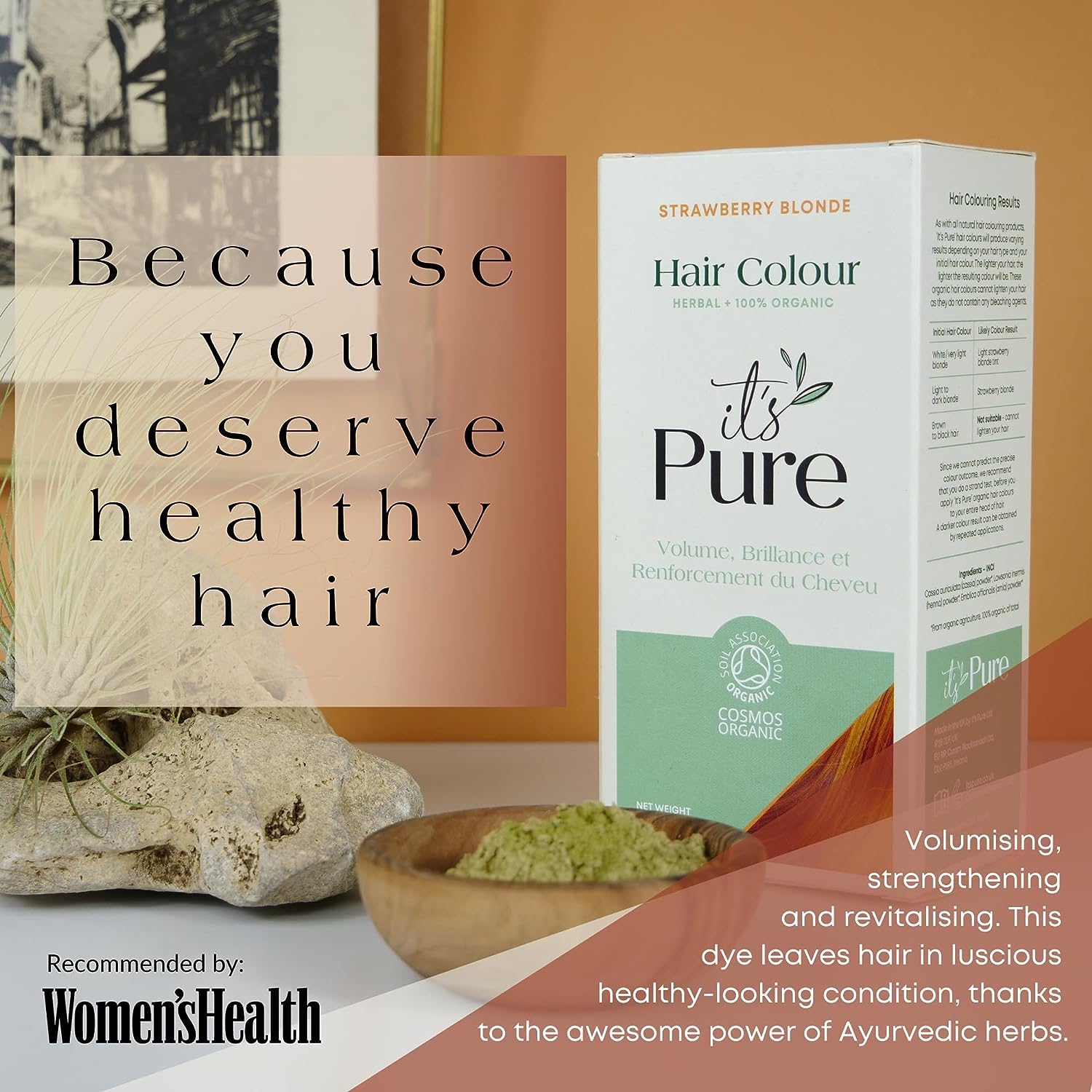 It's Pure Herbal Hair Colour - Strawberry Blonde 110g This hair colour is suitable for blondes who want to enrich their hair with a beautiful Strawberry Blonde tint as well as give their hair radiance and boost the volume of their hair. It’s Pure Strawberry Blonde hair dye is entirely natural and the final result depends on the existing colour of your hair, so will be unique to you.