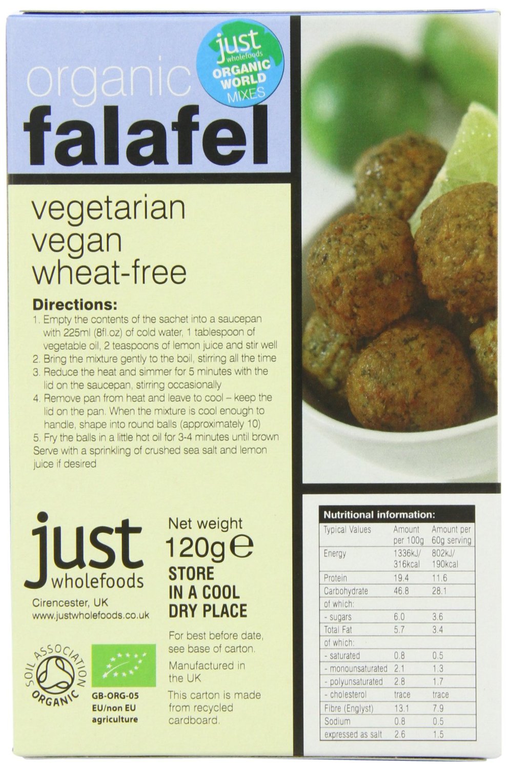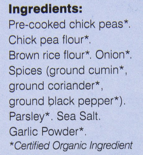Pre-cooked kibbled chick peas*, chick pea flour*, brown rice flour*, onion*, spices (ground cumin*, ground coriander* and ground black pepper*), parsley*, sea salt, garlic powder*. , * - Certified organic ingredient.