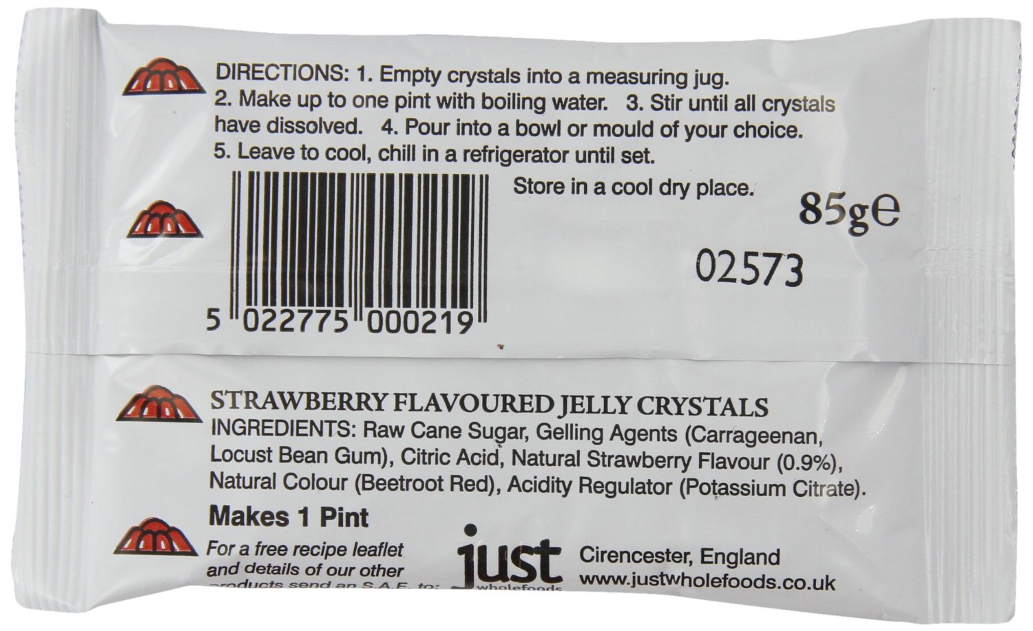 Strawberry flavoured jelly crystals. Makes one pint of jelly. These gelatine free jellies can be enjoyed by all. They contain real fruit flavours and are free from all artificial colours, flavours and preservatives. Suitable for vegetarians.