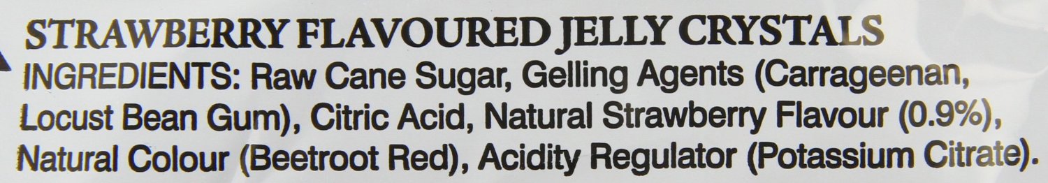 Raw Cane Sugar, Gelling Agents (Carrageenan, Locust Bean Gum), Citric Acid, Natural Strawberry Flavour (0.9%), Natural Colour (Beetroot Red), Acidity Regulator (Potassium Citrate).