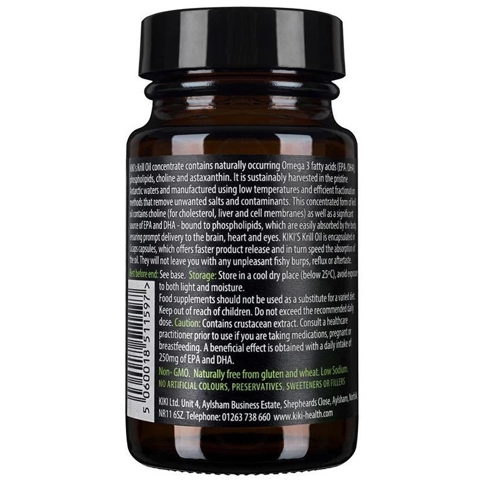 Krill oil by Kiki Health. Krill Oil is sustainably harvested in the pristine Antarctic waters and manufactured using low temperatures and efficient fractionation methods that remove unwanted salts and contaminants. This concentrated form of krill oil contains choline (for cholesterol, liver and cell membranes) as well as a significant source of EPA and DHA ? bound to phospholipids, which are easily absorbed by the body, ensuring prompt delivery to the brain, heart and eyes. This technology offers an optimal preparation process which preserves the krill oil?s natural qualities and ensures its freshness. A beneficial effect is obtained with a daily intake of 250mg of EPA and DHA Easy to swallow Licaps will not leave you with any unpleasant fishy