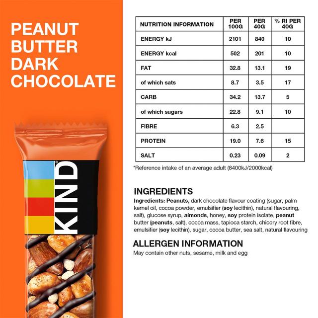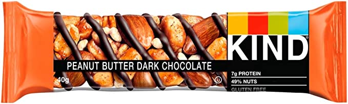Kind Peanut Butter and almond bar with a dark chocolate flavoured coating. This super grain bar of deliciousness is always the first to disappear from our office kitchen stash: whole grains including oats, buckwheat, millet, amaranth, and quinoa are smothered in peanut butter and sprinkled with chunks of dark chocolate and bits of roasted peanuts. 0g trans fat, 100% whole grains, low sodium, no genetically engineered ingredients. kosher, gluten free.