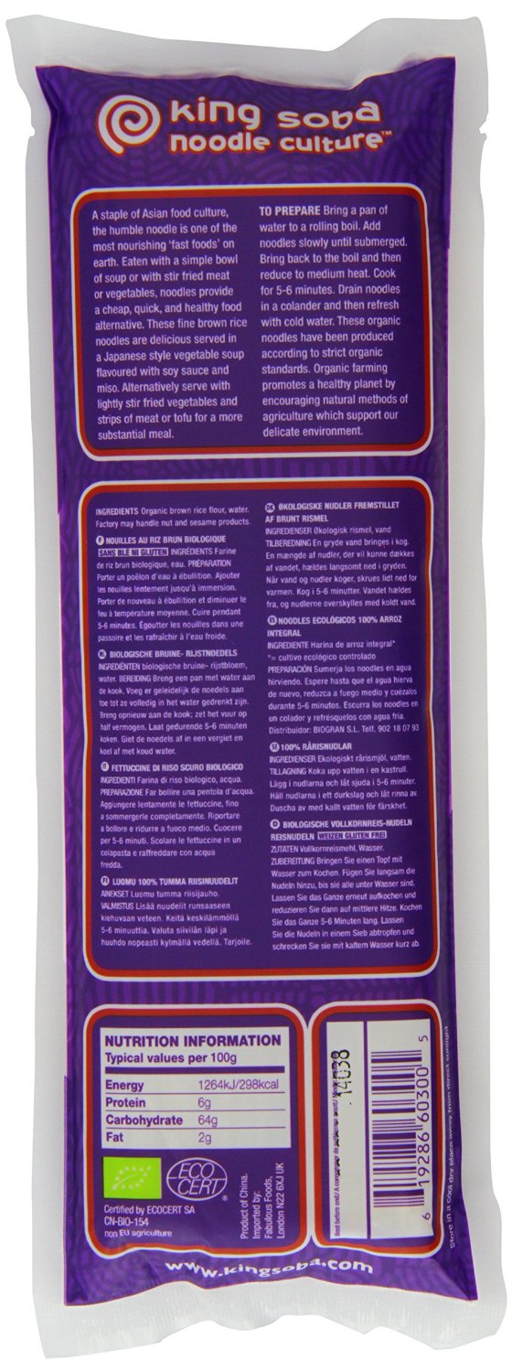 King Soba 100 percent brown rice noodles are organic and wheat and gluten-free. Less processed than white rice, brown rice retains many health-giving nutrients, containing rich amounts of fibre, B vitamins and minerals such as selenium and magnesium. King Soba noodles are kosher, ideal for vegetarians, vegans, celiacs or wheat and gluten sensitive. Noodles provide a quick and healthy food alternative. These fine brown rice noodles are delicious served in a Japanese style vegetable soup or stir-fried with vegetables. Noodles are a highly versatile staple food, try using instead of spaghetti pasta as a healthy, gluten-free alternative.