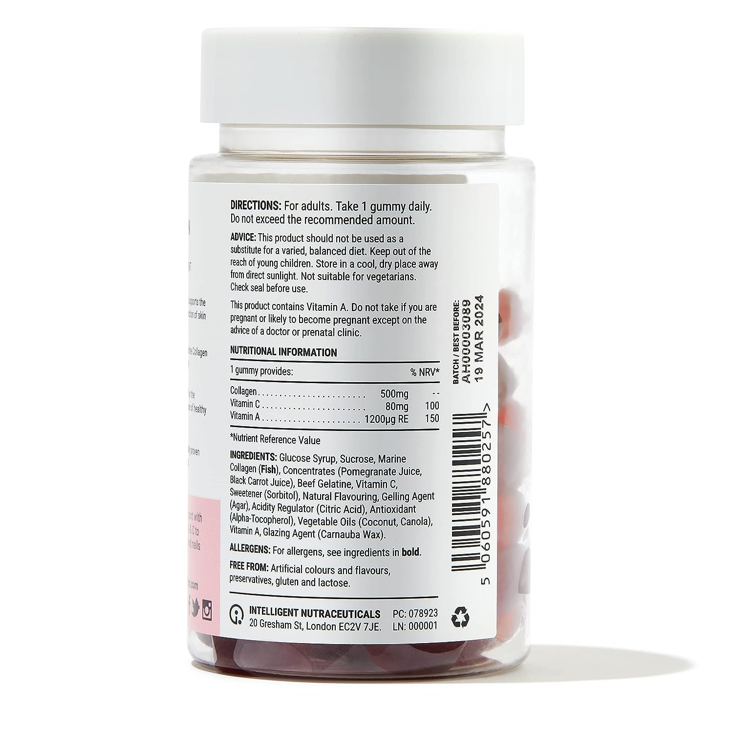 IngredientsGlucose Syrup, Sucrose, Marine Collagen (Fish), Concentrates (Pomegranate Juice, Black Carrot Juice), Beef Gelatine, Vitamin C, Sweetener (Sorbitol), Natural Flavouring, Gelling Agent (Agar), Acidity Regulator (Citric Acid), Antioxidant (Alpha-Tocopherol), Vegetable Oils (Coconut, Canola), Vitamin A, Glazing Agent (Carnauba Wax).