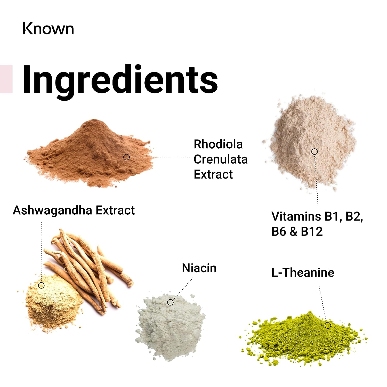 IngredientsSucrose, Glucose Syrup, Water, Gelling Agent (Pectin), L-Theanine, Acids (Citric Acid, Sodium Citrate), Ashwagandha Extract (10:1), Rhodiola Crenulata Extract (6:1), Natural Flavourings (Kumquat, Lemon, Orange), Niacin, Glazing Agents (Carnauba Wax, Vegetable Oil), Sweetener (Sucralose), Vitamin B6 (Pyridoxine Hydrochloride), Vitamin B2 (Riboflavin), Vitamin B1 (Thiamine Hydrochloride), Vitamin B12 (Cyanocobalamin).