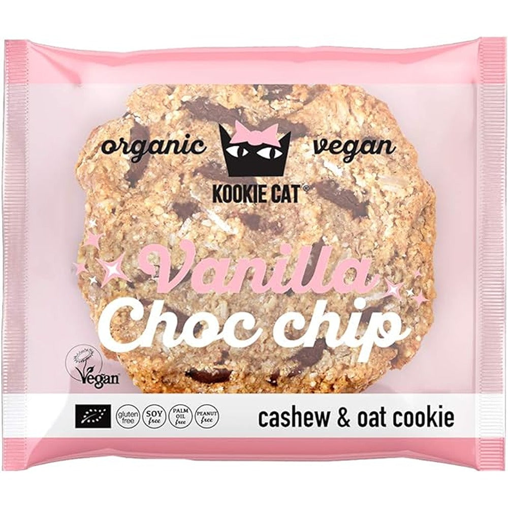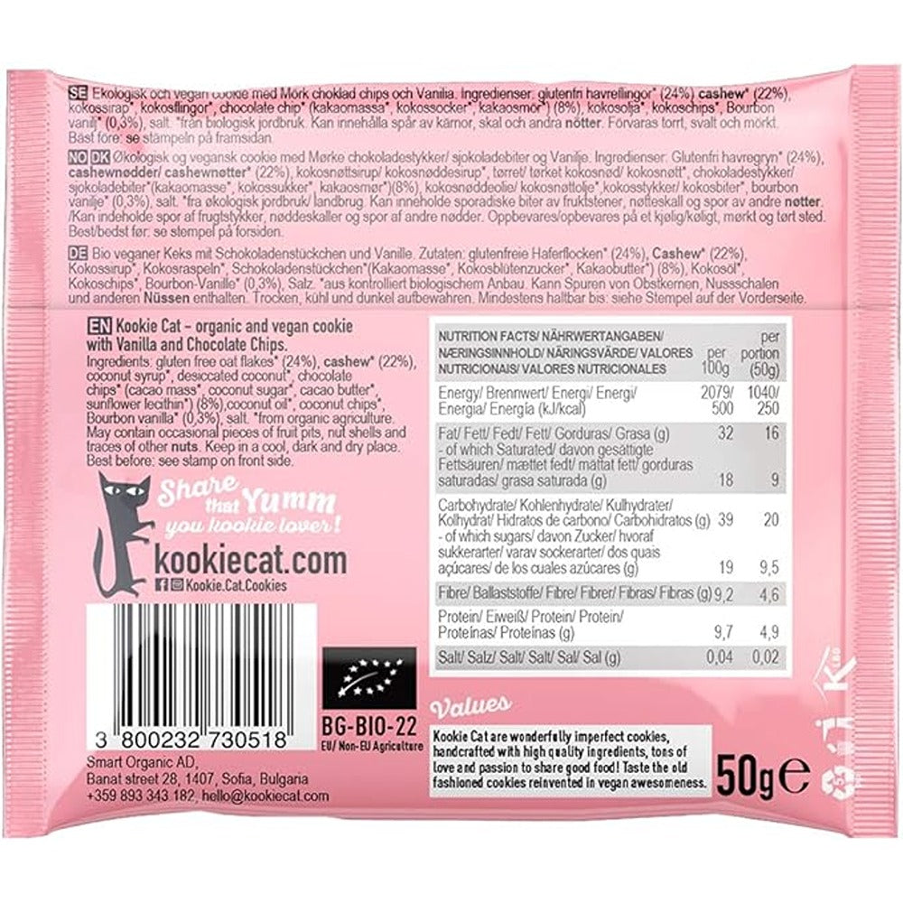 Kookie Cat Organic Vanilla Choc Chip Cashew and Oat Cookie ingredient from organic agriculture. Delicate bourbon vanilla taste, topped with delicious chocolate chips. The princess of cookies that will take over your senses graciously. It is suitable for vegans. Available in 12 packets of 50 g each.