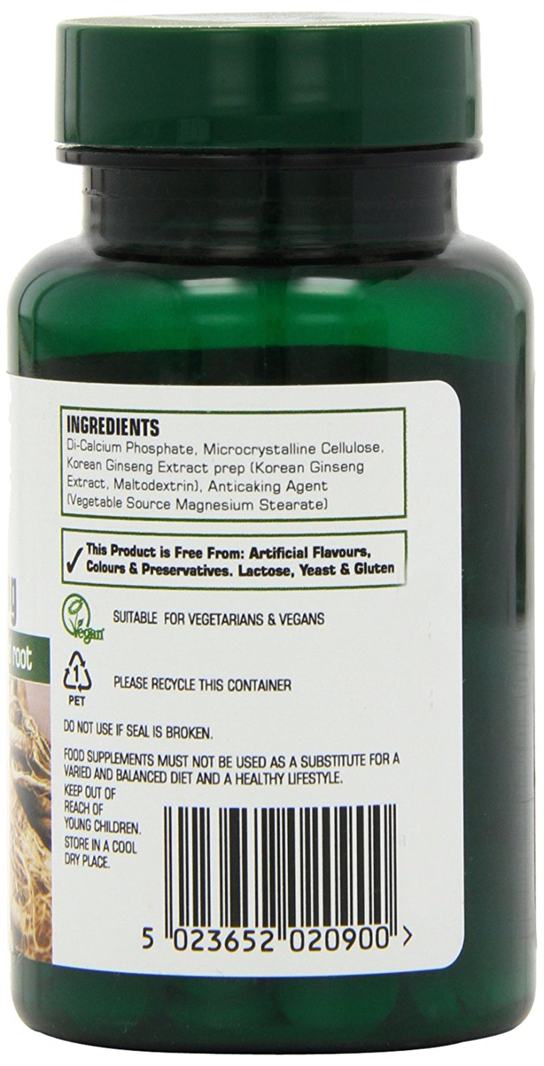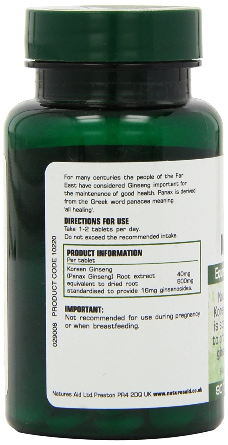 Natures Aid Korean Ginseng tablet provides 600mg of Panax ginseng root. Ginseng is important for the maintenance of good health. Ginseng is a natural stimulant that helps stabilise blood pressure, support the immune system and increase both the libido and your stamina. Available in 90 tablets.