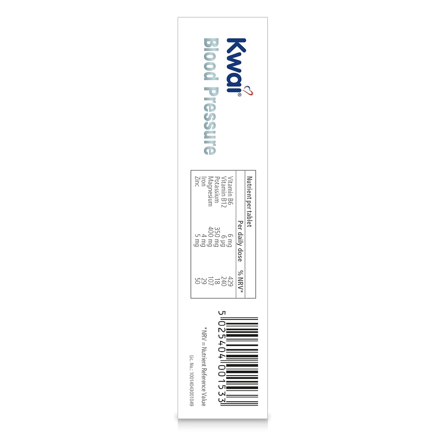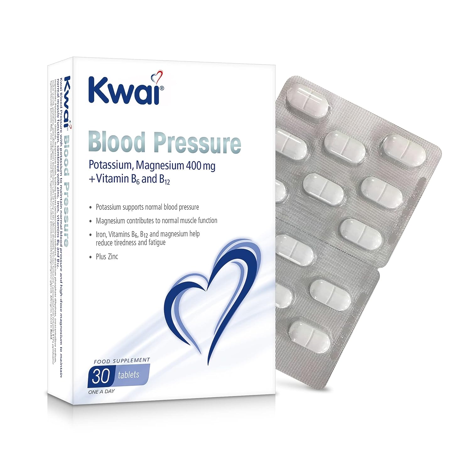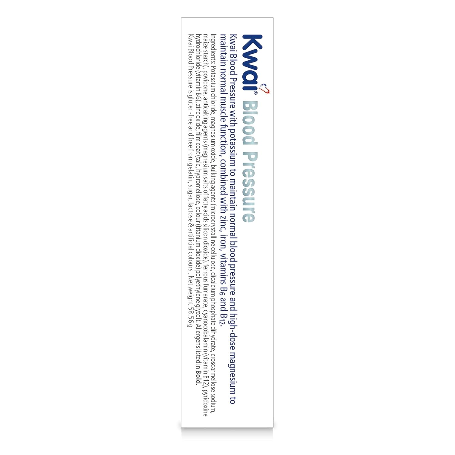 Kwai Blood Pressure At the heart of a healthy life is a healthy heart Kwai Blood Pressure is a blend of nutrients specifically selected to help maintain normal blood pressure and heart muscle function. Each tablet contains a high dose of Magnesium, a mineral substance necessary for life and required for the maintenance of normal muscle contraction, including the heart muscle. In addition, Kwai Blood Pressure delivers Potassium, which plays an important role in maintaining muscle function and contributing to the maintenance of normal blood pressure. Vitamins B6, B12, Iron and Magnesium also contribute to the reduction of tiredness and fatigue. Potassium helps maintain normal blood pressure Provides Magnesium to help support heart muscle function Vitamins B6, B12 and Iron help reduce tiredness and fatigue Zinc contributes to the normal metabolism of fatty acids 30 one a day tablets