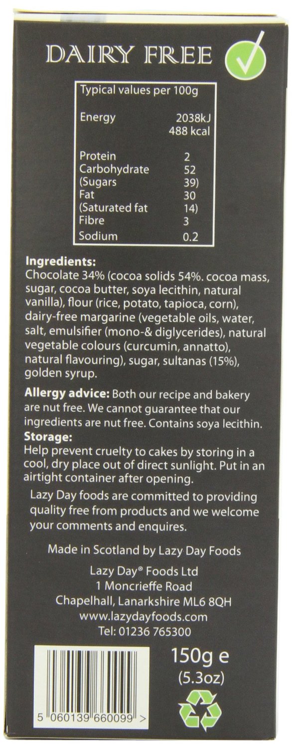 IngredientsChocolate (34%) (cocoa solids 55% cocoa mass, sugar, cocoa butter, SOYA lecithin, natural vanilla), flour (rice, tapioca, corn), dairy free margarine [palm oil*, rape seed oil, water, salt, emulsifier (mono-& diglycerides), natural vegetable colours (curcumin, annatto), natural flavouring], sugar, sultanas (15%), golden syrup, SOYA lecithin. *Palm oil is RSPO certified.