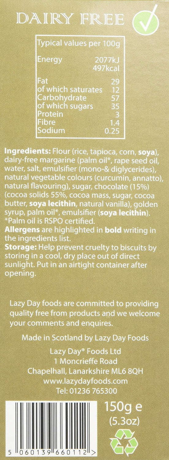 IngredientsFlour (rice, tapioca, corn, SOYA), dairy free margarine [palm oil*, rape seed oil, water, salt, emulsifier (mono-& diglycerides), natural vegetable colours (curcumin, annatto), natural flavouring], sugar, chocolate (15%) (cocoa solids 55% cocoa mass, sugar, cocoa butter, SOYA lecithin, natural vanilla), golden syrup, palm Oil*, emulsifier (SOYA lecithin). *Palm oil is RSPO certified.