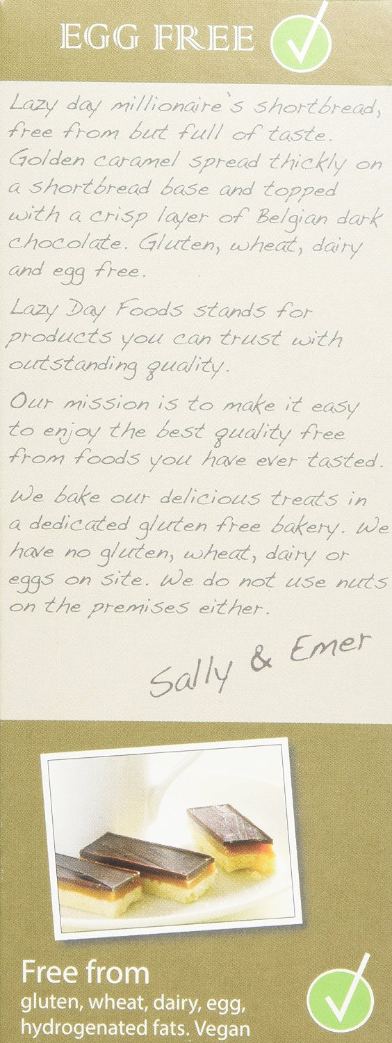 Lazy Day Foods Millionaires Shortbread is delicious golden dairy free caramel topping a shortbread biscuit base and hand finished with Belgian dark chocolate. It is free from gluten, wheat, dairy and lactose. It is suitable for coeliac and vegans.