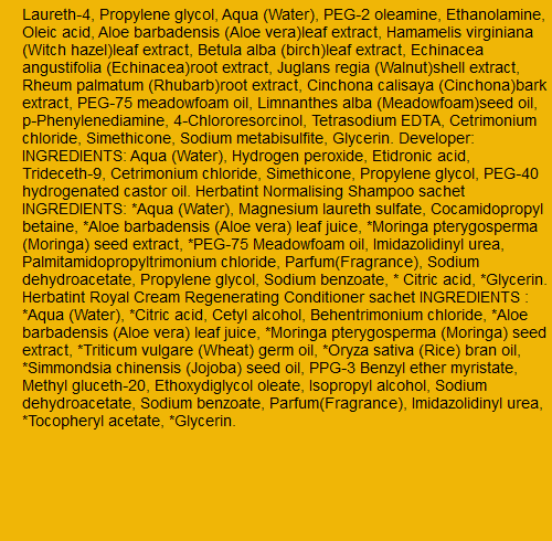 IngredientsLaureth-4, Propylene glycol, Aqua (Water), PEG-2 oleamine, Ethanolamine, Oleic acid, Aloe barbadensis (Aloe vera)leaf extract, Hamamelis virginiana (Witch hazel)leaf extract, Betula alba (birch)leaf extract, Echinacea angustifolia (Echinacea)root extract, Juglans regia (Walnut)shell extract, Rheum palmatum (Rhubarb)root extract, Cinchona calisaya (Cinchona)bark extract, PEG-75 meadowfoam oil, Limnanthes alba (Meadowfoam)seed oil, p-Phenylenediamine, 4-Chlororesorcinol, Tetrasodium EDTA, Cetrimonium chloride, Simethicone, Sodium metabisulfite, Glycerin. Developer: INGREDIENTS: Aqua (Water), Hydrogen peroxide, Etidronic acid, Trideceth-9, Cetrimonium chloride, Simethicone, Propylene glycol, PEG-40 hydrogenated castor oil. Herbatint Normalising Shampoo sachet INGREDIENTS: *Aqua (Water), Magnesium laureth sulfate, Cocamidopropyl betaine, *Aloe barbadensis (Aloe vera) leaf juice, *Moringa pterygosperma (Moringa) seed extract, *PEG-75 Meadowfoam oil, Imidazolidinyl urea, Palmitamidopropyltrimonium chloride, Parfum(Fragrance), Sodium dehydroacetate, Propylene glycol, Sodium benzoate, * Citric acid, *Glycerin. Herbatint Royal Cream Regenerating Conditioner sachet INGREDIENTS : *Aqua (Water), *Citric acid, Cetyl alcohol, Behentrimonium chloride, *Aloe barbadensis (Aloe vera) leaf juice, *Moringa pterygosperma (Moringa) seed extract, *Triticum vulgare (Wheat) germ oil, *Oryza sativa (Rice) bran oil, *Simmondsia chinensis (Jojoba) seed oil, PPG-3 Benzyl ether myristate, Methyl gluceth-20, Ethoxydiglycol oleate, Isopropyl alcohol, Sodium dehydroacetate, Sodium benzoate, Parfum(Fragrance), Imidazolidinyl urea, *Tocopheryl acetate, *Glycerin.
