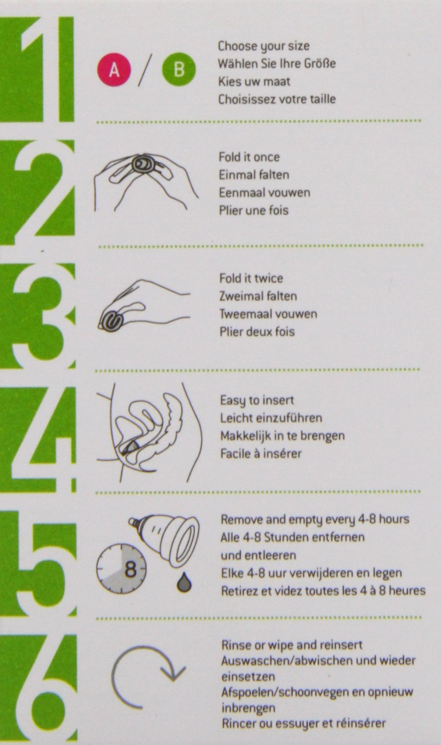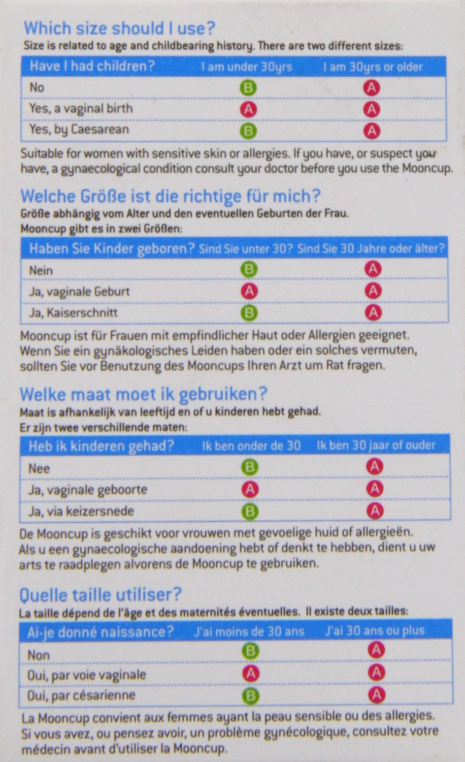 Mooncup Menstrual Cup is a reusable cup made of soft medical-grade silicone. It is worn internally like a tampon but collects menstrual fluid rather than absorbing. A light seal is formed with your vaginal walls allowing your menstrual fluid to pass into the mooncup without leakage or odour. The mooncup menstrual cup contains no bleaches, deodorisers or absorbency gels. The smooth surface of the mooncup allows the mucus membranes of your vaginal wall to continue their essential cleansing and protective functions. The mooncup does not absorb your body's natural defence mechanisms and will not deposit fibres in your vaginal wall. Available in size B.