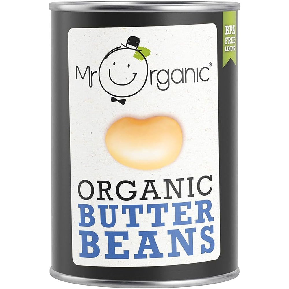 No Added Salt or Sugar ? 1 of Your 5 a Day ? BPA Free Packaging ? Gluten Free ? Organic & Natural ? Cooked & Ready to Eat ? Vegan ? Zero Air Miles Organic butter beans simply in water! All of Mr Organic?s bean production is in house! This means each tin of our tasty beans is filled with Mr Organic?s personal attention, love and care. We can now keep an even closer eye on making sure our beans are carefully selected, washed, cooked and packed in our BPA free tins by our bean experts in Italy. All Mr. Organic food is made with organically grown ingredients and love for our planet