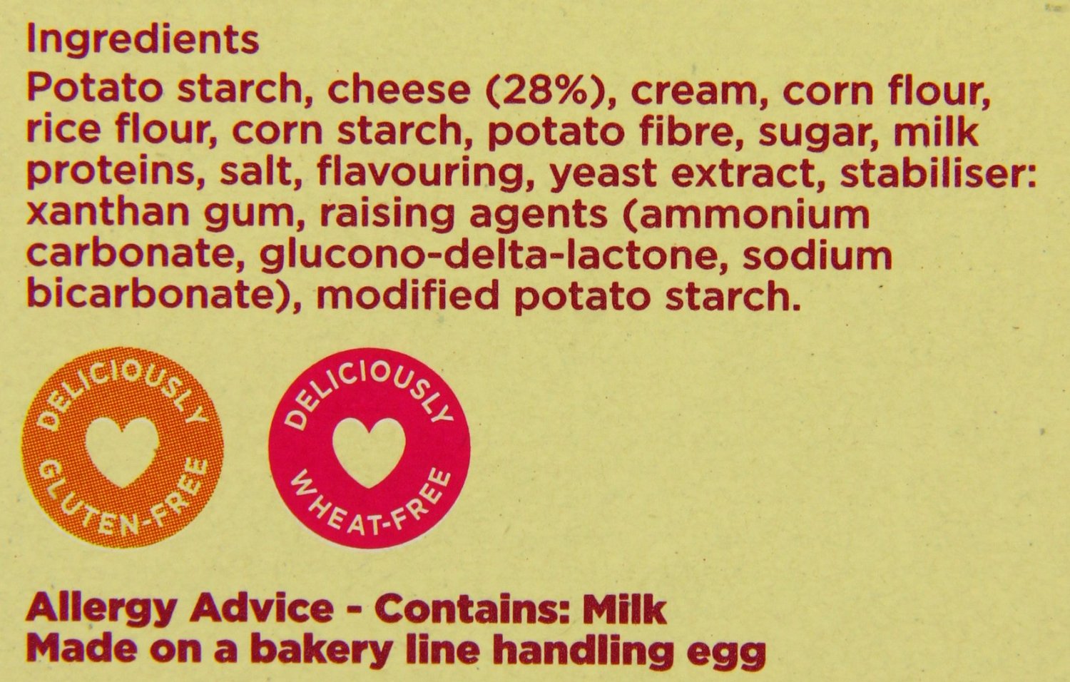 IngredientsPotato starch, Gouda cheese (MILK) (28%), cream (contains MILK, stabiliser: carrageenan), corn flour, rice flour, corn starch, potato fibre, sugar, salt, emulsifier: mono- and di-glycerides of fatty acids, yeast extract, stabiliser: xanthan gum, raising agents: ammonium bicarbonate, glucono-delta-lactone, sodium bicarbonate, modified potato starch.