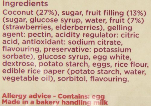 IngredientsCoconut (27%), sugar, glucose syrup, fruit filling (12%) glucose fructose syrup, sugar, fruit juice 7% (strawberries, elderberries), water, thickener: pectin; acidity regulators: citric acid; sodium citrate, natural flavouring], egg white, dextrose, potato starch, EGGS, edible paper (potato starch, water, sunflower oil, olive oil), rice flour, stabilser: sorbitol; natural flavouring.