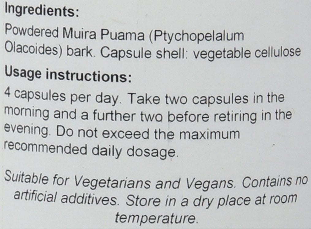 IngredientsPowdered Muira Puama (Ptychopetalum Olacoides) bark 5:1 extract. Capsule shell: vegetable cellulose.