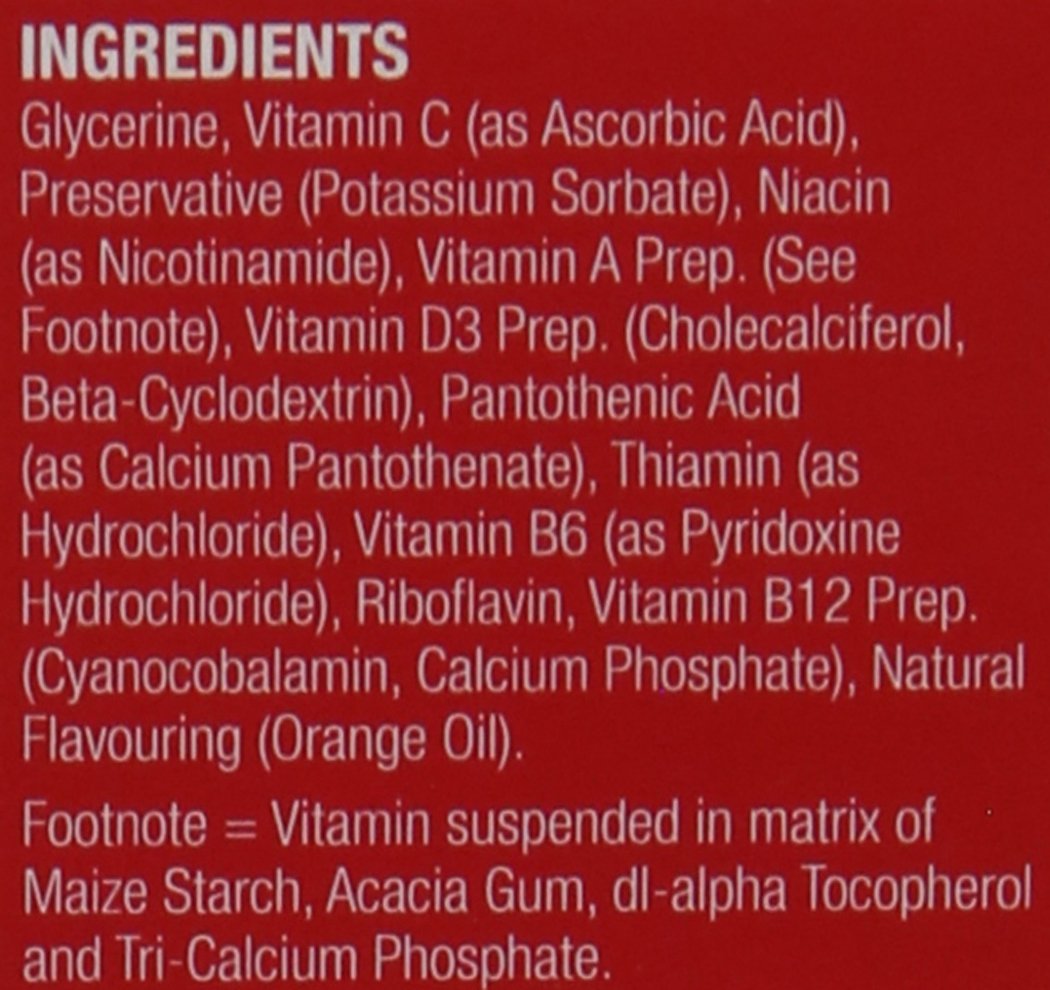 IngredientsGlycerine, Preservative (Potassium Sorbate), Natural Flavouring (Orange Oil). Footnote = Vitamin suspended in matrix of Maize Starch, Acacia Gum, dl-alpha Tocopherol and Tri-Calcium Phosphate.