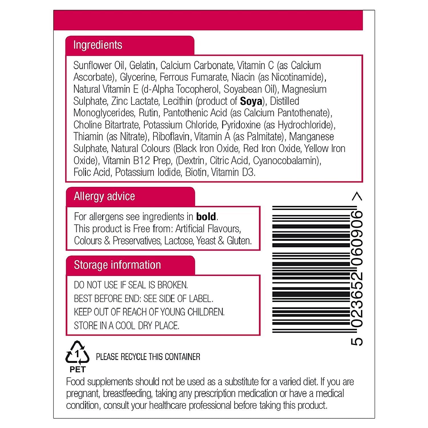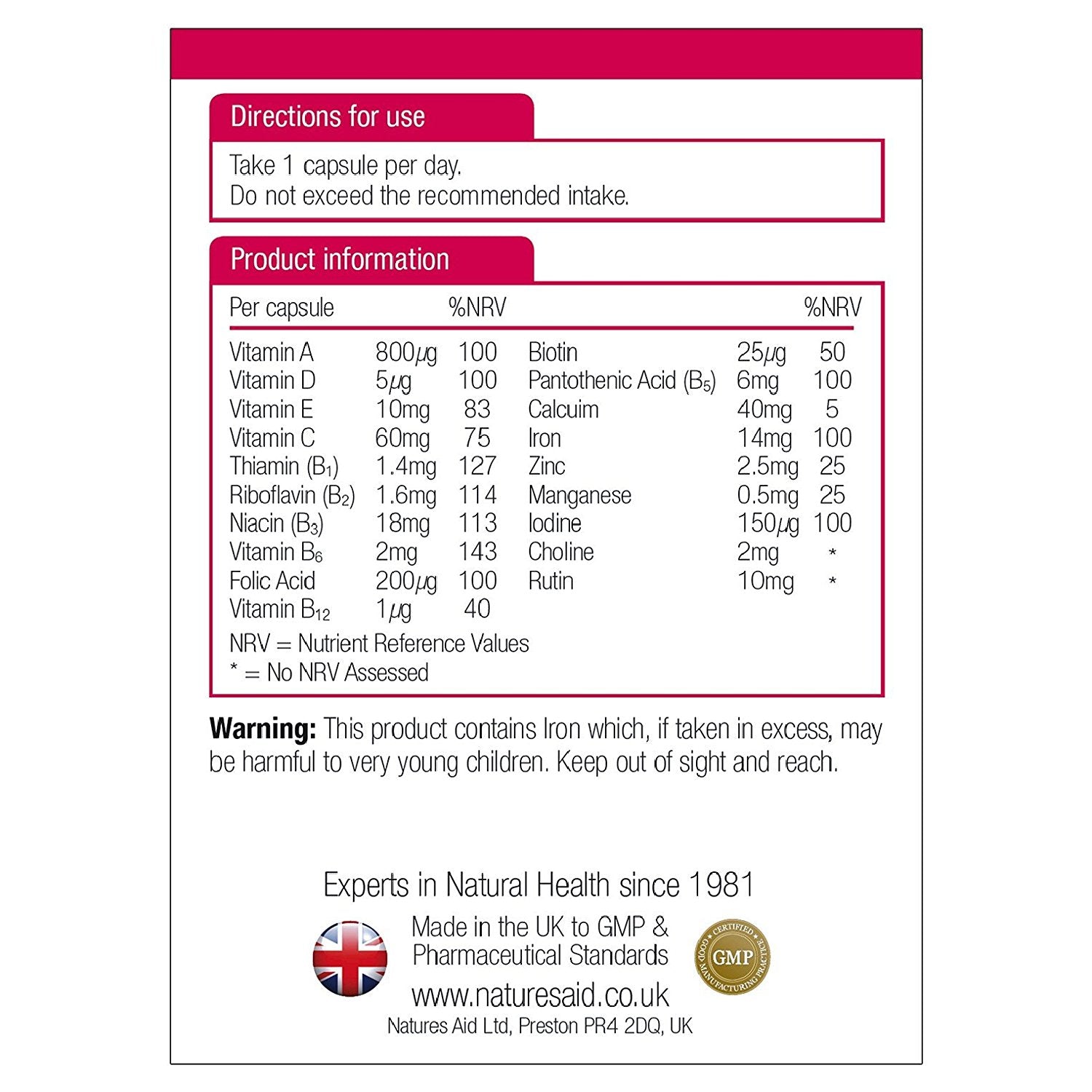 Natures Aid Multi-Vitamins and Minerals with Iron is a daily multi-nutrient formula designed to provide support for energy, immune, brain and bone health. Each daily capsule provides several energy-yielding nutrients, including Iron for normal blood formation; niacin, vitamin B1 and vitamin B5 for normal energy-yielding metabolism and Vitamins B2, B6 and B12 for the reduction of tiredness and fatigue. Active ingredients to support the immune system, including Vitamins C and D which contribute to normal functioning of the immune system. Iron for normal cognitive function and vitamins B6, B12 and niacin for normal psychological function. Provides vitamins: A; B1; B2; B3; B5; B6; B12; C; D and E with Folic acid, biotin, calcium, iron, zinc, manganese, iodine, choline and rutin. Available in 60 softgel.