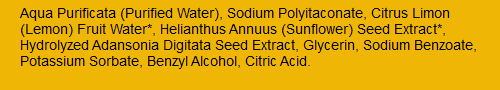 Aqua Purificata (Purified Water), Sodium Polyitaconate, Citrus Limon (Lemon) Fruit Water*, Helianthus Annuus (Sunflower) Seed Extract*, Hydrolyzed Adansonia Digitata Seed Extract, Glycerin, Sodium Benzoate, Potassium Sorbate, Benzyl Alcohol, Citric Acid.