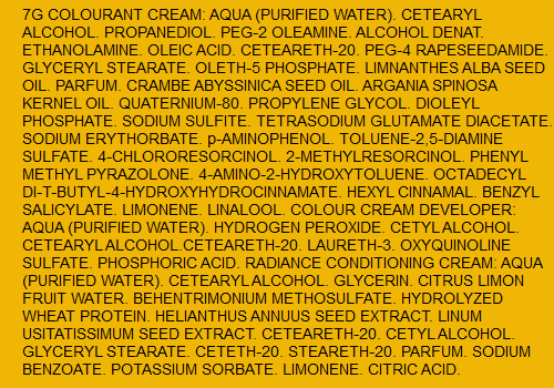7G COLOURANT CREAM: AQUA (PURIFIED WATER). CETEARYL ALCOHOL. PROPANEDIOL. PEG-2 OLEAMINE. ALCOHOL DENAT. ETHANOLAMINE. OLEIC ACID. CETEARETH-20. PEG-4 RAPESEEDAMIDE. GLYCERYL STEARATE. OLETH-5 PHOSPHATE. LIMNANTHES ALBA SEED OIL. PARFUM. CRAMBE ABYSSINICA SEED OIL. ARGANIA SPINOSA KERNEL OIL. QUATERNIUM-80. PROPYLENE GLYCOL. DIOLEYL PHOSPHATE. SODIUM SULFITE. TETRASODIUM GLUTAMATE DIACETATE. SODIUM ERYTHORBATE. p-AMINOPHENOL. TOLUENE-2,5-DIAMINE SULFATE. 4-CHLORORESORCINOL. 2-METHYLRESORCINOL. PHENYL METHYL PYRAZOLONE. 4-AMINO-2-HYDROXYTOLUENE. OCTADECYL DI-T-BUTYL-4-HYDROXYHYDROCINNAMATE. HEXYL CINNAMAL. BENZYL SALICYLATE. LIMONENE. LINALOOL. COLOUR CREAM DEVELOPER: AQUA (PURIFIED WATER). HYDROGEN PEROXIDE. CETYL ALCOHOL. CETEARYL ALCOHOL.CETEARETH-20. LAURETH-3. OXYQUINOLINE SULFATE. PHOSPHORIC ACID. RADIANCE CONDITIONING CREAM: AQUA (PURIFIED WATER). CETEARYL ALCOHOL. GLYCERIN. CITRUS LIMON FRUIT WATER. BEHENTRIMONIUM METHOSULFATE. HYDROLYZED WHEAT PROTEIN. HELIANTHUS ANNUUS SEED EXTRACT. LINUM USITATISSIMUM SEED EXTRACT. CETEARETH-20. CETYL ALCOHOL. GLYCERYL STEARATE. CETETH-20. STEARETH-20. PARFUM. SODIUM BENZOATE. POTASSIUM SORBATE. LIMONENE. CITRIC ACID.