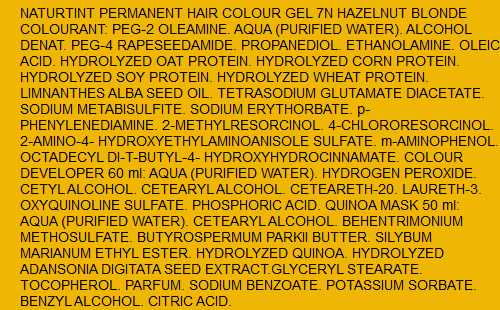 IngredientsNATURTINT PERMANENT HAIR COLOUR GEL 7N HAZELNUT BLONDE COLOURANT: PEG-2 OLEAMINE. AQUA (PURIFIED WATER). ALCOHOL DENAT. PEG-4 RAPESEEDAMIDE. PROPANEDIOL. ETHANOLAMINE. OLEIC ACID. HYDROLYZED OAT PROTEIN. HYDROLYZED CORN PROTEIN. HYDROLYZED SOY PROTEIN. HYDROLYZED WHEAT PROTEIN. LIMNANTHES ALBA SEED OIL. TETRASODIUM GLUTAMATE DIACETATE. SODIUM METABISULFITE. SODIUM ERYTHORBATE. p- PHENYLENEDIAMINE. 2-METHYLRESORCINOL. 4-CHLORORESORCINOL. 2-AMINO-4- HYDROXYETHYLAMINOANISOLE SULFATE. m-AMINOPHENOL. OCTADECYL DI-T-BUTYL-4- HYDROXYHYDROCINNAMATE. COLOUR DEVELOPER 60 ml: AQUA (PURIFIED WATER). HYDROGEN PEROXIDE. CETYL ALCOHOL. CETEARYL ALCOHOL. CETEARETH-20. LAURETH-3. OXYQUINOLINE SULFATE. PHOSPHORIC ACID. QUINOA MASK 50 ml: AQUA (PURIFIED WATER). CETEARYL ALCOHOL. BEHENTRIMONIUM METHOSULFATE. BUTYROSPERMUM PARKII BUTTER. SILYBUM MARIANUM ETHYL ESTER. HYDROLYZED QUINOA. HYDROLYZED ADANSONIA DIGITATA SEED EXTRACT.GLYCERYL STEARATE. TOCOPHEROL. PARFUM. SODIUM BENZOATE. POTASSIUM SORBATE. BENZYL ALCOHOL. CITRIC ACID.