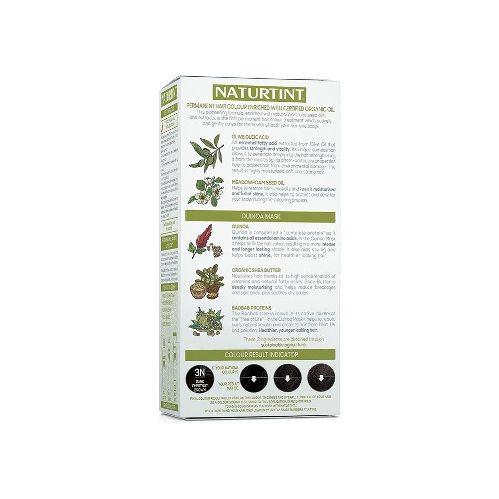 Naturtint Permanent Hair Colour is free from ammonia and featuring plant-based active ingredients. The ammonia- free hair colour nor does it contain other harsh chemicals that can irritate and damage your hair. The active plant-based ingredients and the pH of the colorant cream help to open the external cuticle layer of the hair naturally. Next, the natural colour of the hair is removed, and micro-pigments penetrate the deepest layers of the hair with the new colour. Provides colour that lasts while leaving hair healthier and revitalized. Gives intense and radiant colour. Low chemical content. 100 Percent grey coverage. No parabens, no resorcinol, no ammonia, dermatologically tested. This Box Contains: Protective Gloves, Instruction Leaflet, 60ml Naturtint Colorant, 60ml Colour Developer, 35ml Nutrideep Multiplier and 15 ml Shampoo. Available in 3N dark chestnut brown colour.