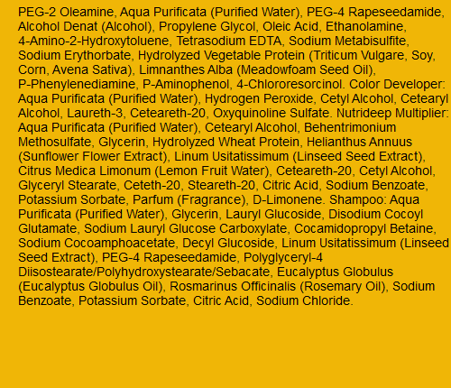 IngredientsPEG-2 Oleamine, Aqua Purificata (Purified Water), PEG-4 Rapeseedamide, Alcohol Denat (Alcohol), Propylene Glycol, Oleic Acid, Ethanolamine, 4-Amino-2-Hydroxytoluene, Tetrasodium EDTA, Sodium Metabisulfite, Sodium Erythorbate, Hydrolyzed Vegetable Protein (Triticum Vulgare, Soy, Corn, Avena Sativa), Limnanthes Alba (Meadowfoam Seed Oil), P-Phenylenediamine, P-Aminophenol, 4-Chlororesorcinol. Color Developer: Aqua Purificata (Purified Water), Hydrogen Peroxide, Cetyl Alcohol, Cetearyl Alcohol, Laureth-3, Ceteareth-20, Oxyquinoline Sulfate. Nutrideep Multiplier: Aqua Purificata (Purified Water), Cetearyl Alcohol, Behentrimonium Methosulfate, Glycerin, Hydrolyzed Wheat Protein, Helianthus Annuus (Sunflower Flower Extract), Linum Usitatissimum (Linseed Seed Extract), Citrus Medica Limonum (Lemon Fruit Water), Ceteareth-20, Cetyl Alcohol, Glyceryl Stearate, Ceteth-20, Steareth-20, Citric Acid, Sodium Benzoate, Potassium Sorbate, Parfum (Fragrance), D-Limonene. Shampoo: Aqua Purificata (Purified Water), Glycerin, Lauryl Glucoside, Disodium Cocoyl Glutamate, Sodium Lauryl Glucose Carboxylate, Cocamidopropyl Betaine, Sodium Cocoamphoacetate, Decyl Glucoside, Linum Usitatissimum (Linseed Seed Extract), PEG-4 Rapeseedamide, Polyglyceryl-4 Diisostearate/Polyhydroxystearate/Sebacate, Eucalyptus Globulus (Eucalyptus Globulus Oil), Rosmarinus Officinalis (Rosemary Oil), Sodium Benzoate, Potassium Sorbate, Citric Acid, Sodium Chloride.