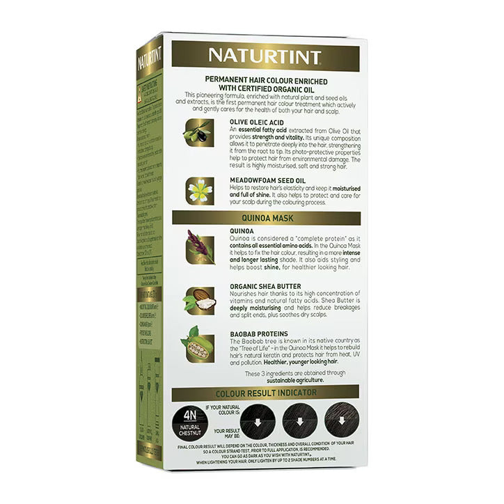 Naturtint Permanent Hair Colour is free from ammonia and featuring plant-based active ingredients. The ammonia- free hair colour nor does it contain other harsh chemicals that can irritate and damage your hair. The active plant-based ingredients and the pH of the colorant cream help to open the external cuticle layer of the hair naturally. Next, the natural colour of the hair is removed, and micro-pigments penetrate the deepest layers of the hair with the new colour. Provides colour that lasts while leaving hair healthier and revitalized. Gives intense and radiant colour. Low chemical content. 100 Percent grey coverage. No parabens, no resorcinol, no ammonia, dermatologically tested. This Box Contains: Protective Gloves, Instruction Leaflet, 60ml Naturtint Colorant, 60ml Colour Developer, 35ml Nutrideep Multiplier and 15 ml Shampoo. Available in 4N natural chestnut colour.