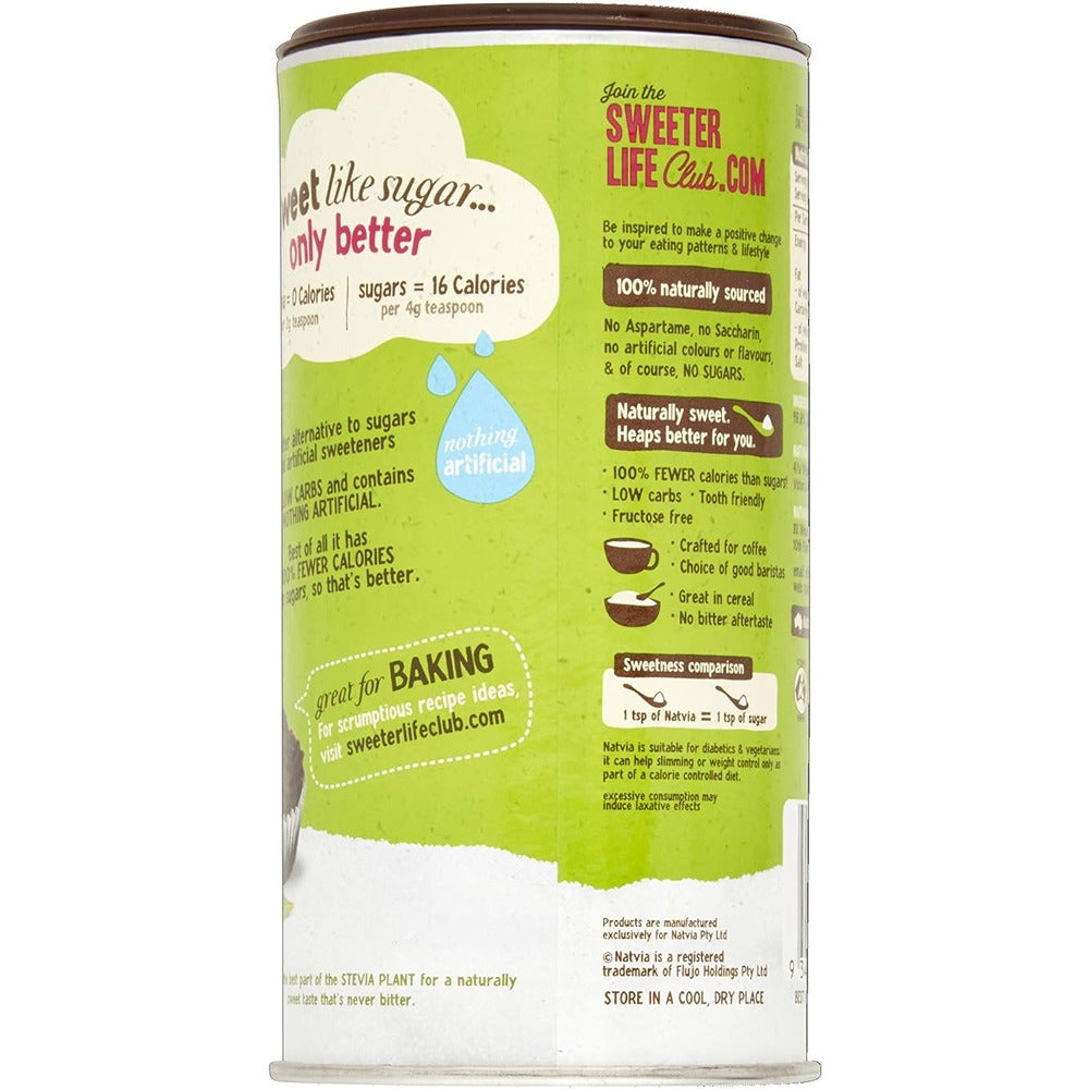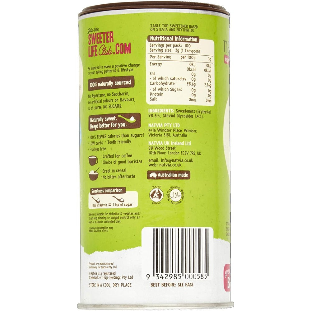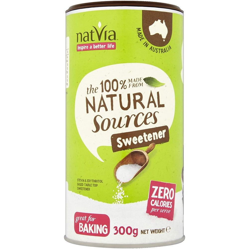 Natvia Natural Sweetener Canister is made of 100 percent natural source sweetener. A better alternative to sugars and artificial sweeteners. It's low carbs and contains nothing artificial. Perfect for tea, coffee and baking. It contains 4 canisters of 200 g each.