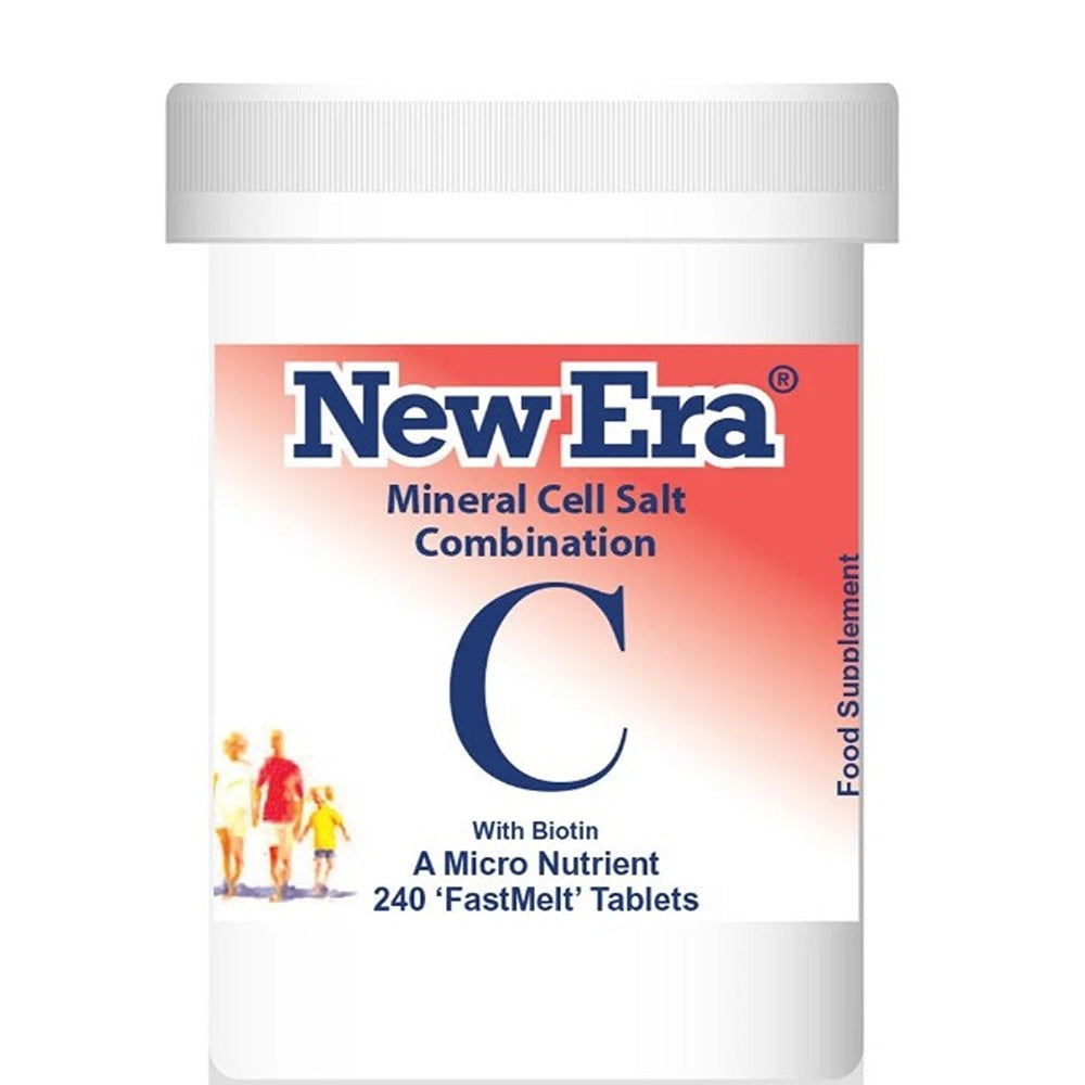 New Era Mineral Cell Salt Combination C with biotin contains magnesium phosphate, sodium phosphate, sodium sulphate and silicon dioxide. It is a micronutrient. Fast melt tablets easily melt under the tongue. Their cell salt nutrients are therefore more rapidly absorbed into the bloodstream than any ordinary tablet can be expected to achieve when chewed, swallowed or taken with a drink. Little extra biotin added an essential nutrient which contributes to the normal energy-yielding metabolism, the functioning of the nervous system, normal macronutrient metabolism and psychological function. It also contributes to the maintenance of normal hair, skin and to the maintenance of normal mucous membranes. These health claims are approved as per the EU Register on Nutrition and Health Claims. Available in 240 tablets.
