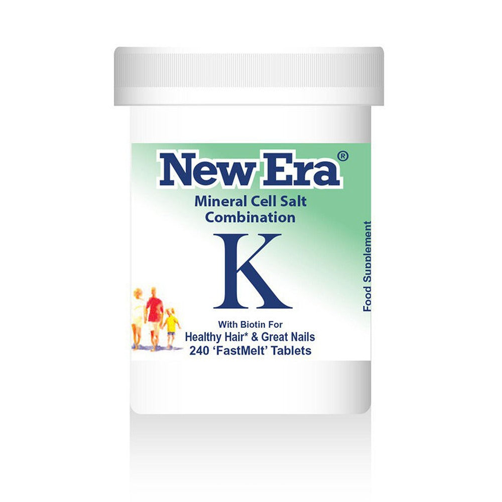 New Era Mineral Cell Salt Combination K with biotin contributes to normal hair and nail health. Fast melt tablets easily melt under the tongue. Their cell salt nutrients are therefore more rapidly absorbed into the bloodstream than any ordinary tablet can be expected to achieve when chewed, swallowed or taken with a drink. Little extra biotin added an essential nutrient which contributes to the normal energy-yielding metabolism, the functioning of the nervous system, normal macronutrient metabolism and psychological function. It also contributes to the maintenance of normal hair, skin and to the maintenance of normal mucous membranes. These health claims are approved as per the EU Register on Nutrition and Health Claims. Available in 240 tablets.