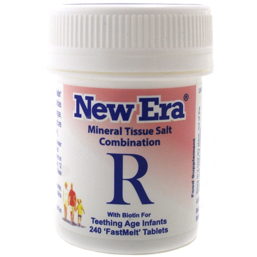 New Era Mineral Cell Salt Combination R with biotin is traditionally used for infants teething pains. Fast melt tablets easily melt under the tongue. Their cell salt nutrients are therefore more rapidly absorbed into the bloodstream than any ordinary tablet can be expected to achieve when chewed, swallowed or taken with a drink. Little extra biotin added an essential nutrient which contributes to the normal energy-yielding metabolism, the functioning of the nervous system, normal macronutrient metabolism and psychological function. It also contributes to the maintenance of normal hair, skin and to the maintenance of normal mucous membranes. These health claims are approved as per the EU Register on Nutrition and Health Claims. Available in 240 tablets.
