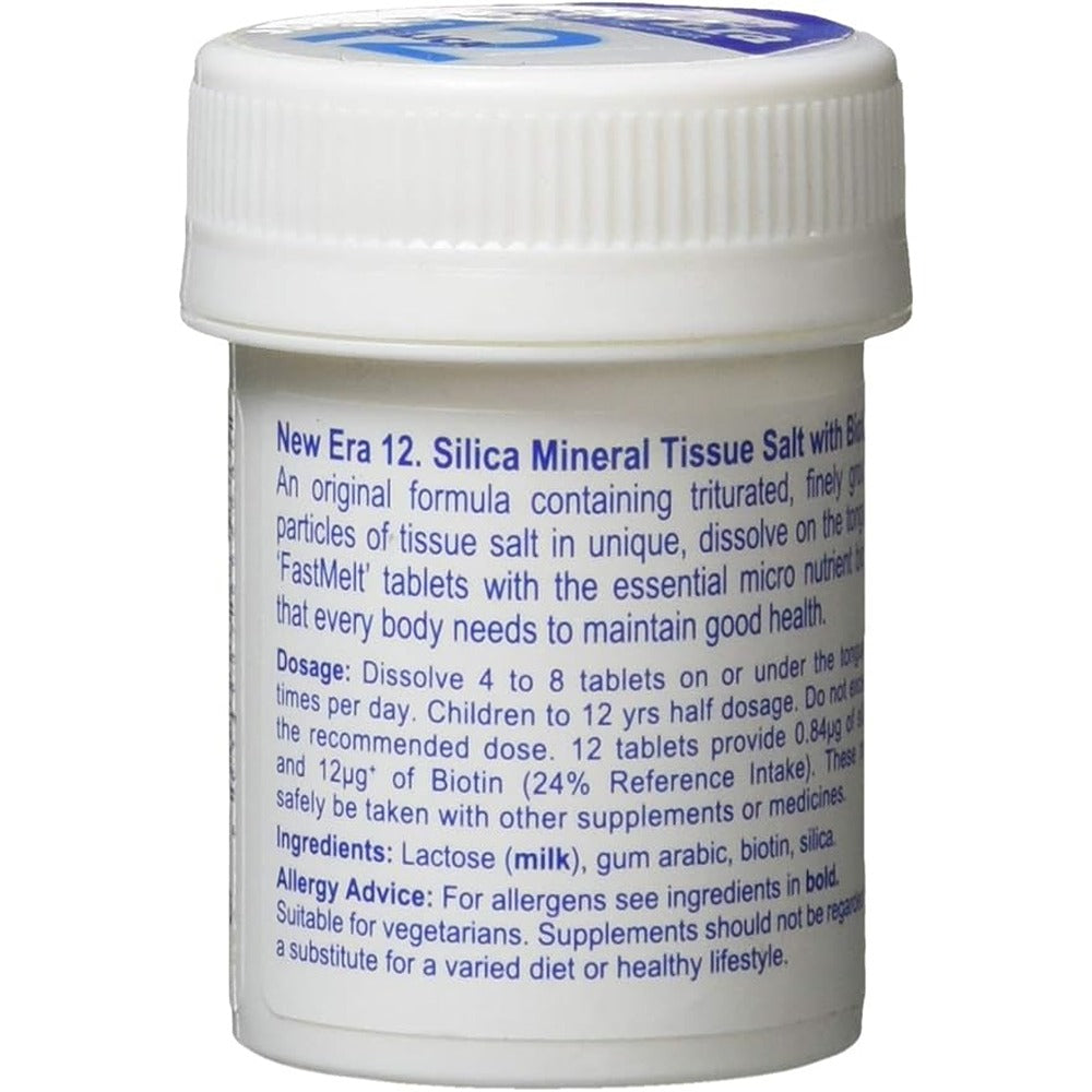 New Era Number 12 Silica (Silicon Dioxide) 240 Tablets contain triturated (finely ground) tiny particles of cell salt in easy to take, dissolve on the tongue 'FastMelt' tablets with the essential nutrient biotin. Each bottle contains 240 small "melt under the tongue" tablets for which New Era is famous. Their cell salt nutrients are therefore more rapidly absorbed into the bloodstream than any ordinary tablet can be expected to achieve when chewed, swallowed or taken with a drink. A little extra Biotin added an essential nutrient which contributes to the Numberrmal energy-yielding metabolism, the functioning of the nervous system, Numberrmal macronutrient metabolism and psychological function. It also contributes to the maintenance of Numberrmal hair, skin and to the maintenance of Numberrmal mucous membranes.