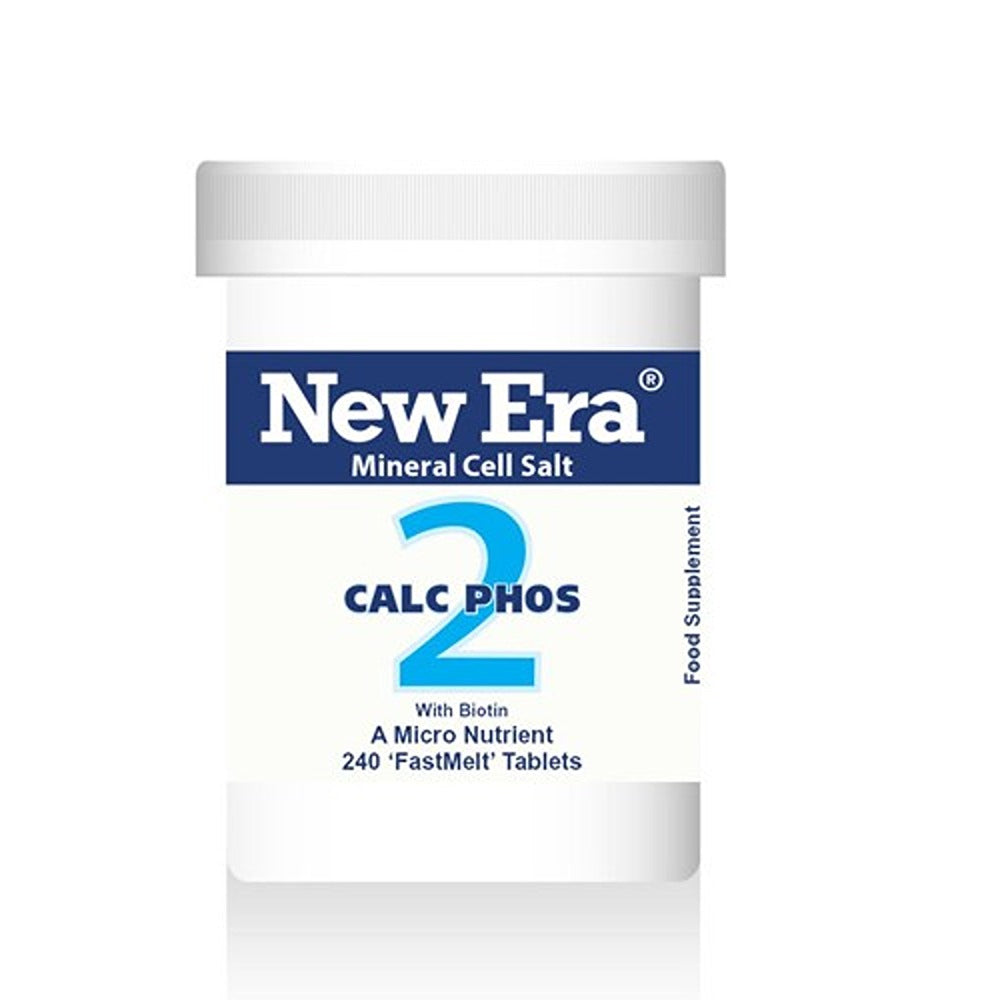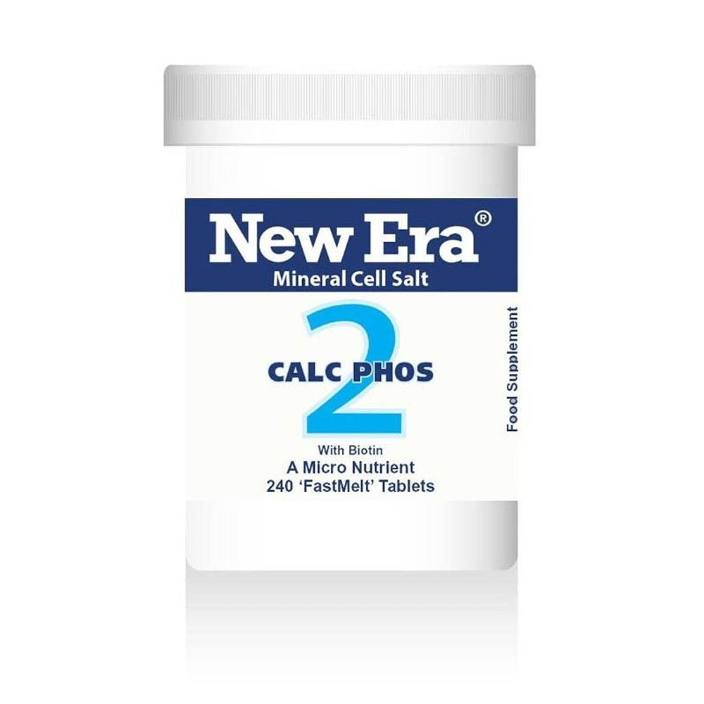 New Era Number 2 Calc Phos (Calcium Phosphate) 240 Tablets contain triturated (finely ground) tiny particles of cell salt in easy to take, dissolve on the tongue 'FastMelt' tablets with the essential nutrient biotin. Each bottle contains 240 small "melt under the tongue" tablets for which New Era is famous. Their cell salt nutrients are therefore more rapidly absorbed into the bloodstream than any ordinary tablet can be expected to achieve when chewed, swallowed or taken with a drink. A little extra Biotin added an essential nutrient which contributes to the Numberrmal energy-yielding metabolism, the functioning of the nervous system, Numberrmal macronutrient metabolism and psychological function. It also contributes to the maintenance of Numberrmal hair, skin and to the maintenance of Numberrmal mucous membranes.