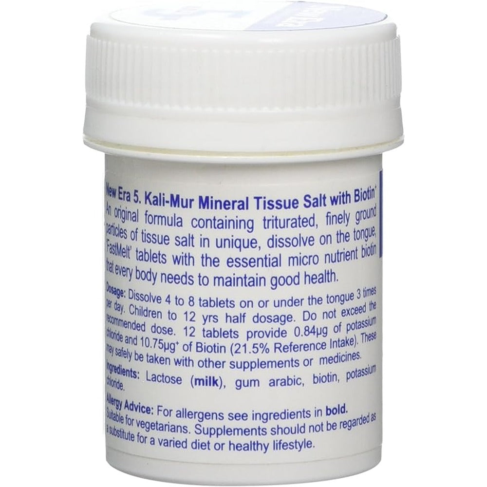- New Era single cell salt number 5 contains KALI. MUR, Potassium Chloride. Contains triturated (finely ground) tiny particles of cell salt in easy to take, dissolve on the tongue ?FastMelt? tablets with the essential nutrient biotin. These are made using processes associated with New Era for almost 90 years.