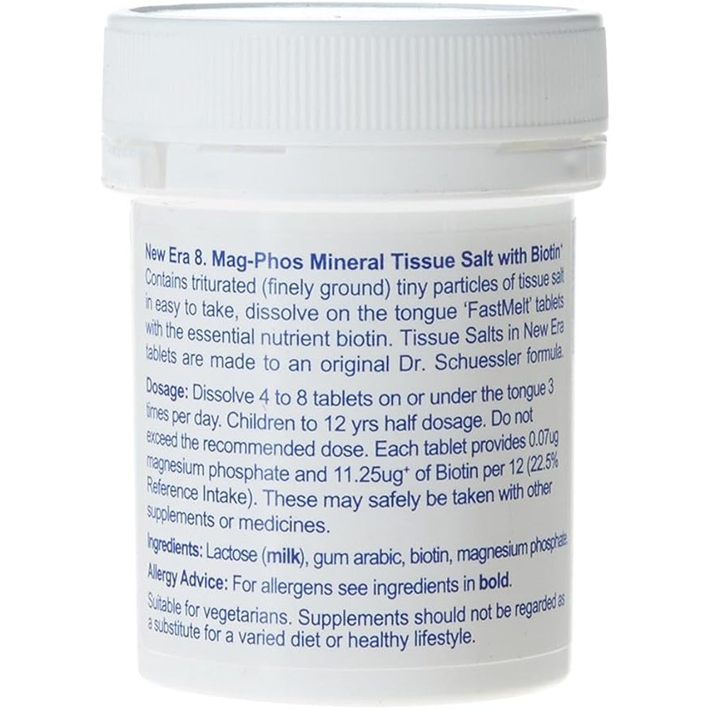 - New Era single cell salt number 8 contains MAG. PHOS, Magnesium Phosphate. Contains triturated (finely ground) tiny particles of cell salt in easy to take, dissolve on the tongue ?FastMelt? tablets with the essential nutrient biotin. These are made using processes associated with New Era for almost 90 years.