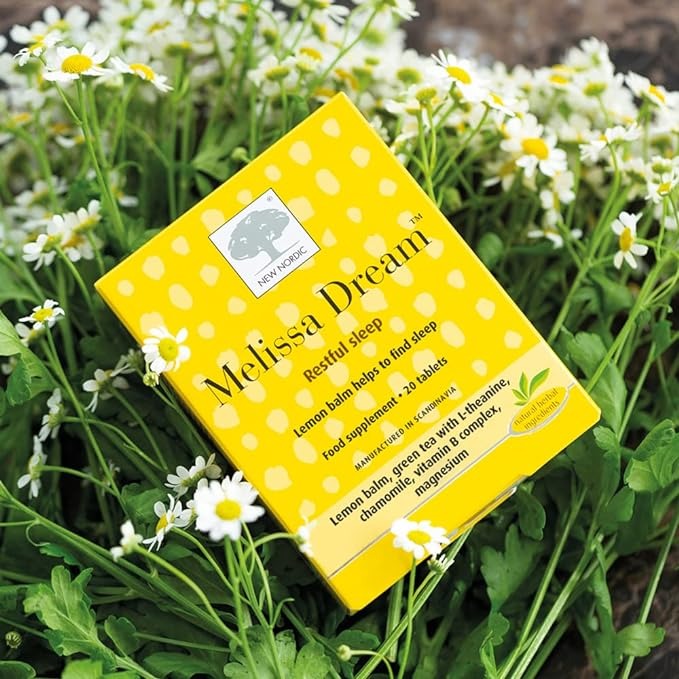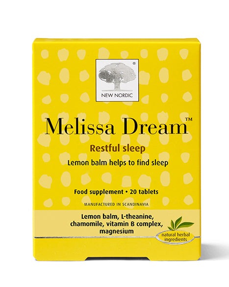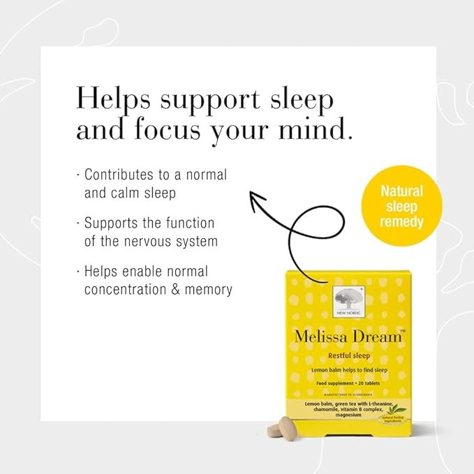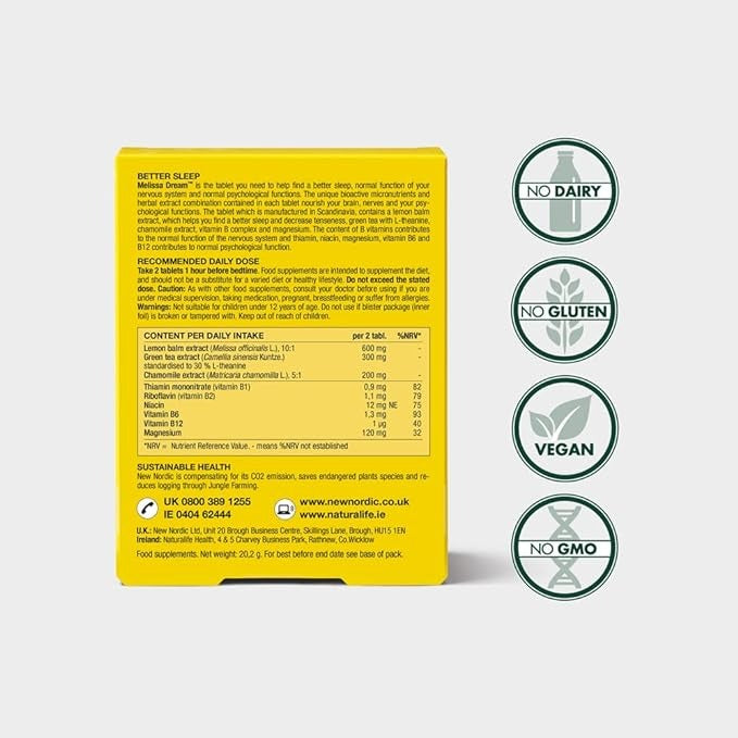 New Nordic Melissa tablets are recommended to people who want help to maintain a healthy calm sleep and relaxation. The Melissa tablets are innovative tablets combining lemon balm, camomile, vitamins and minerals in a formulation which is not causing drowsiness but nourishes the body to relaxation and tranquillity. Melissa tablets include lemon balm, which helps maintain a healthy and calm sleep and relaxation plus B vitamins which help maintain a normal function of the nervous system. The tablets content of magnesium helps normal muscle contraction all night.