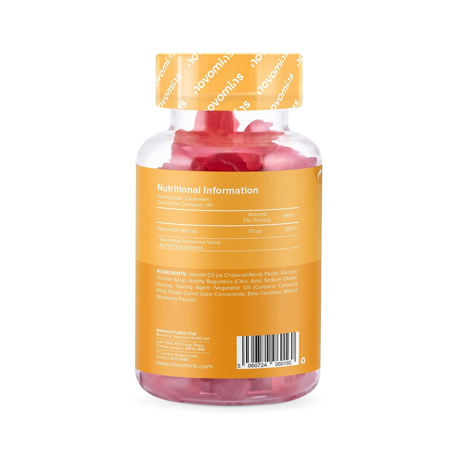 IngredientsVitamin D3 (as Cholecalciferol), Pectin, Glucose, Glucose Syrup, Acidity Regulators (Citric Acid, Sodium Citrate), Sucrose, Glazing Agent (Vegetable Oil (Contain Carnauba Wax) Purple Carrot Juice Concentrate, Beta Carotene, Natural Strawberry Flavour