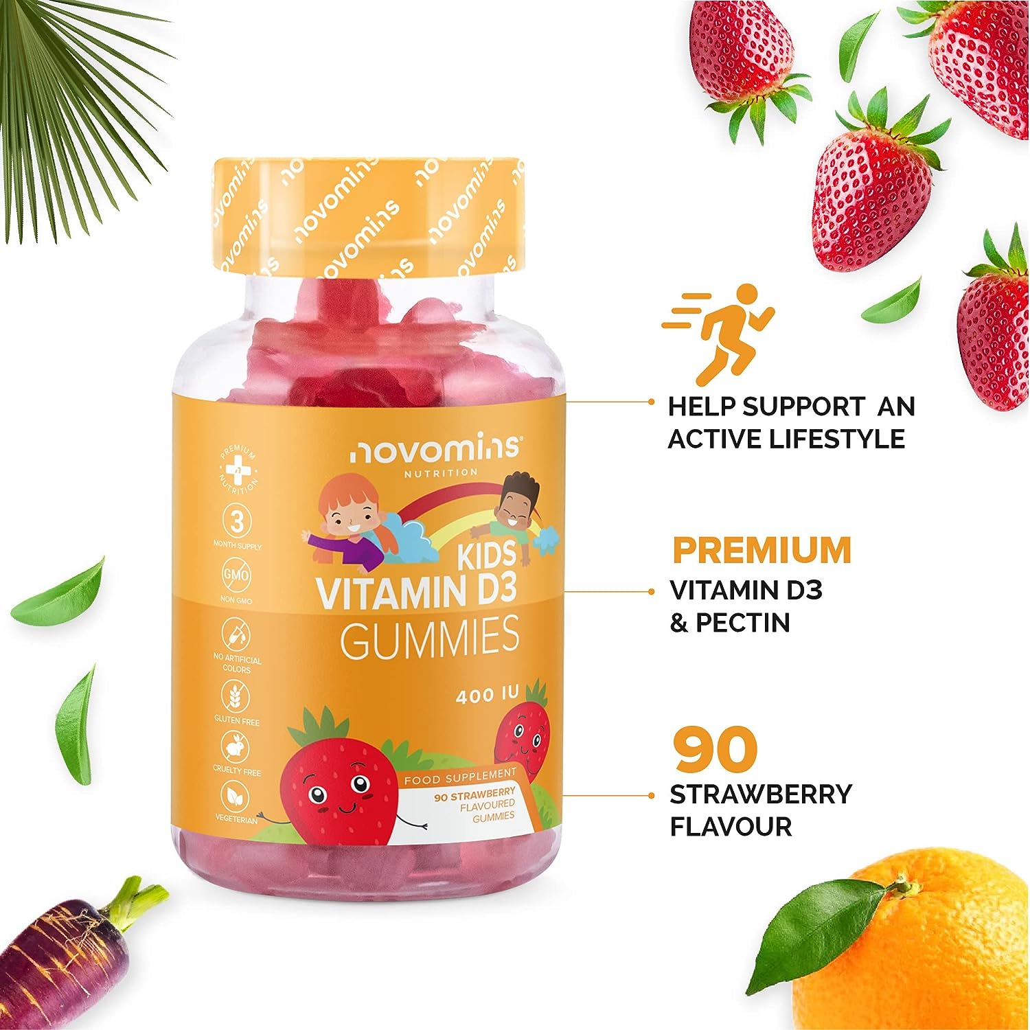Our Kid's Vitamin D3 Gummies contain 400IU (10 ?g) of Vitamin D, the recommended level advised by the UK Department of Health. Not only are they vegetarian they also come in a 90 day supply and are a little lifesaver for parents who are looking to provide their kids with their required Vitamin D without the daily fuss. They are suitable for 3 years+ and come in a delicious, easy to chew, strawberry flavour to please the fussiest of eaters.
