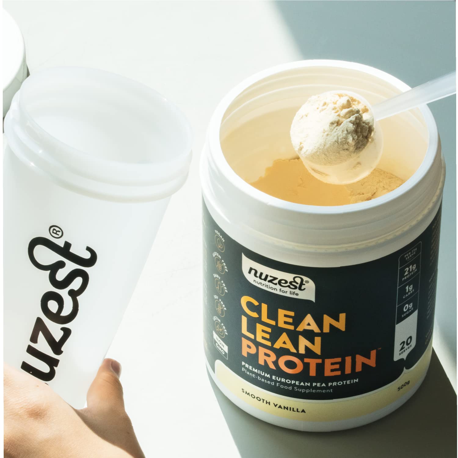Nuzest's CLEAN LEAN PROTEIN Smooth Vanilla 500g approx. 20 servings - each with 21.1g protein and 0.0g sugar. Nuzest's Clean Lean Protein (CLP) comes from premium quality European Golden Peas (Pisum sativum), grown in France under conditions protecting them from environmental toxins. The protein is extracted using a patented process and blended with natural flavours in an ultra-modern facility under strict Good Manufacturing Practice (GMP) codes to ensure quality and safety. No Bad Stuff: FREE from gluten, dairy, eggs, nuts, soy, corn and lectins. No added sucrose or other sugars and no artificial additives, preservatives, sweeteners, artificial flavours, colours or GMOs. Low FODMAP. The World Health Organisation (WHO) advises that a healthy adult requires at least 0.83 grams of protein for each kilogram of body weight per day. That's close to 60 grams of pure protein per 70 kg adult. But for pregnant or breastfeeding mothers, or very active individuals, protein needs may be as much as 3 g per kilogram of body weight daily. HOW TO TAKE CLEAN LEAN PROTEIN: TAKE IT DURING THE DAY AS A SNACK, OR POST WORKOUT TO AID YOUR BODY'S RECOVERY. It's quick and easy- simply add two scoops, or one single-serve sachet, to a glass of water and shake or stir. For a sweeter tasting option, try mixing Clean Lean Protein with coconut water, and enjoy. WHY CLEAN LEAN PROTEIN HAS THE ADVANTAGE: Clean Lean Protein is the ideal protein supplement to support an active lifestyle and good nutrition. Ideal for those wanting to look, feel and perform at their best. Clean Lean Protein is: - High in protein content (80-88%), which is over 4 times higher than the equivalent weight of red meat, chicken or fish - For the growth and maintenance of muscle mass*, as well as for maintaining normal bones* - All natural, 100% vegetable, FREE from gluten, dairy, eggs, nuts, soy, corn and lectin. No added sucrose or other sugars and no artificial additives, preservatives, sweeteners, artificial flavours, colours or GMOs. Low FODMAP. - A complete protein containing all 9 essential amino acids plus more - High in protein offering satiation, with fat and carb ratios to support healthy weight management - High glutamine level means it's easy to digest and absorb, and particularly gentle on the gut - Alkaline, which supports a natural acid/alkaline balance - Available in 4 truly amazing flavours: Smooth Vanilla, Rich Chocolate, Creamy Cappuccino (Decaf) and Natural Strawberry that appeal to adults and children alike plus Just Natural (unflavoured) for cooking etc