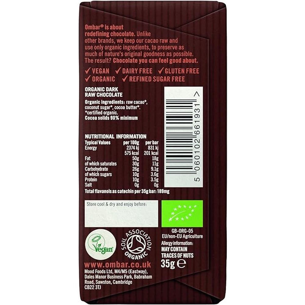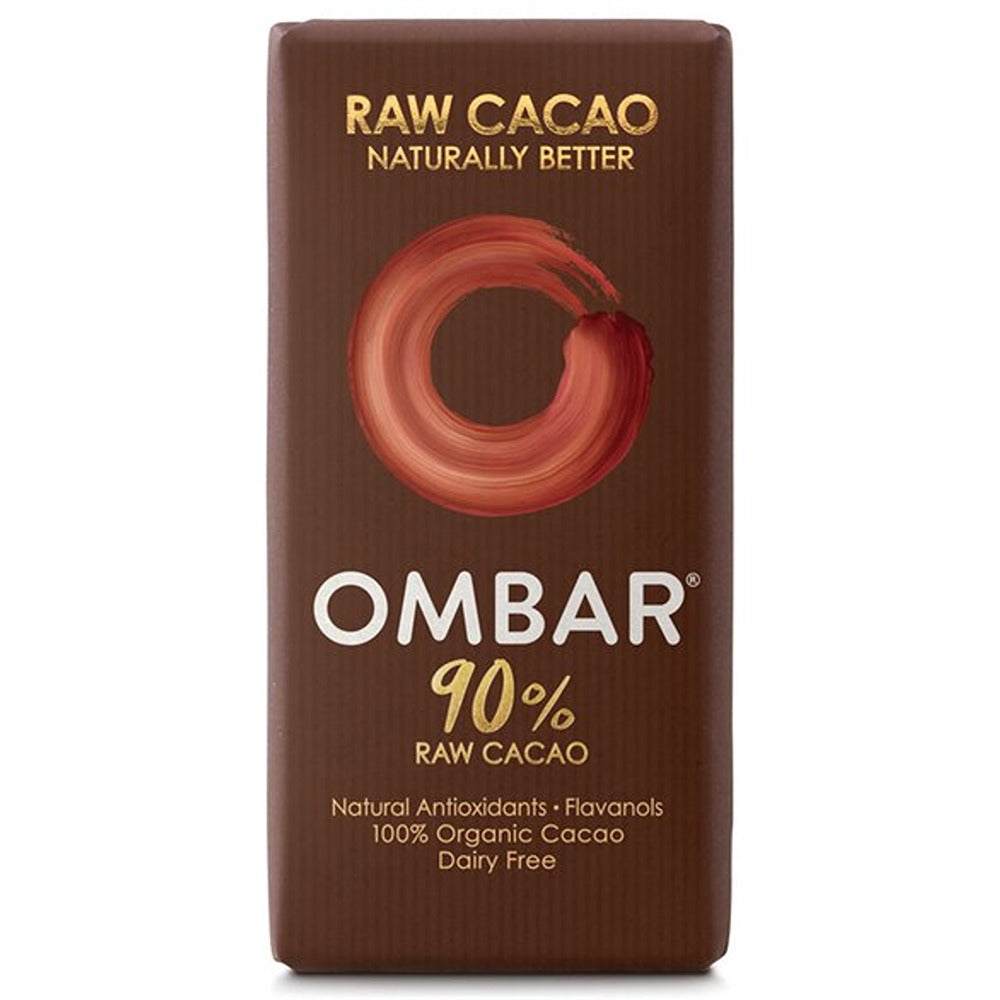 Ombar organic pure 90 percent raw chocolate, intense, dark raw chocolate. This bar lets the Ecuadorian Arriba Nacional bean speak for itself, lightly sweetened with coconut sugar, the rich, floral notes of the raw cacao bring out a superior, chocolate taste. The higher the cacao content the higher the flavanols, magnesium and manganese and due to Ombar's low temperature, raw manufacture these nutritional benefits remain vital in the bar.