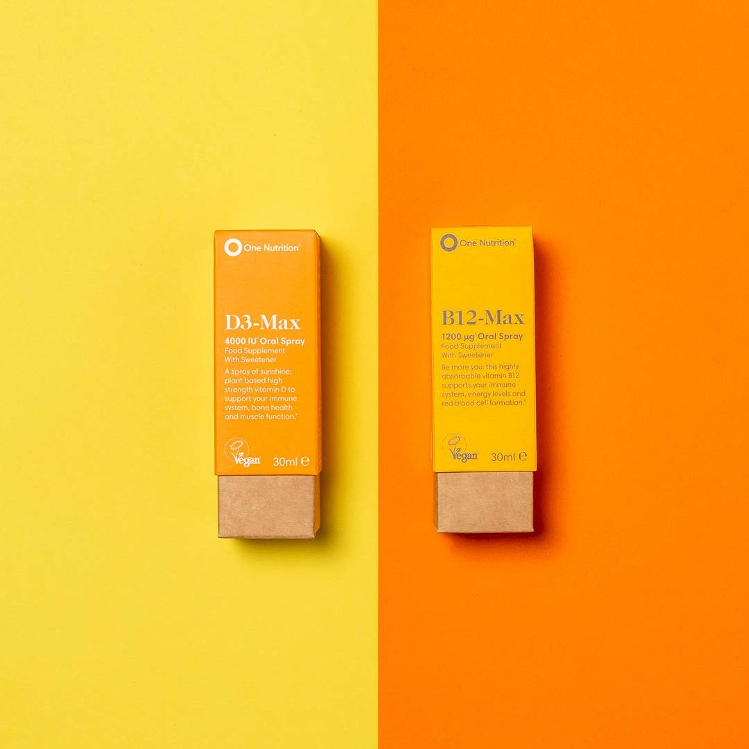 One Nutrition B12-Max Oral Spray - 30ml Simple and convenient, the highly absorbable One Nutrition B12-Max Oral Spray is an easy way to top up your vitamin B12 levels. The handy oral spray format is ideal for those on the go. B12-Max is best taken under the tongue so it is absorbed quickly and effectively, getting to work much quicker than tablets. Ideal for those following a vegetarian or vegan diet, as the main sources of B12 in the common diet are animal-based. Natural orange flavour 6 sprays delivers 1200mcg of vitamin B12; 220 sprays per bottle Simple and convenient support for the immune system, energy levels and red blood cell formation Essential for Vegetarians, Vegans and for use while travelling Sustainable packaging