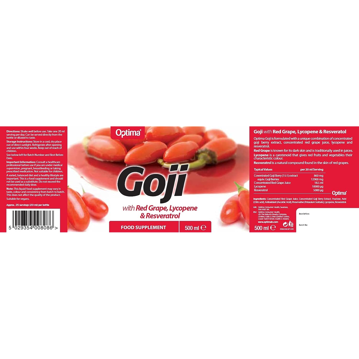IngredientsConcentrated Goji Fruit (lycium barbarum) Juice, Concentrated Red Grape Juice, Fructose, Acid (Citric acid), Antioxidant (Ascorbic acid), Preservative (Potassium sorbate), Lycopene, Resveratrol.