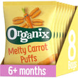 Organix Melty Carrot Puffs Organic Baby Finger Food Snack. Delight little learners with our Melty Carrot Puffs for babies. We bake corn and carrots into sticks that are chunky, easy to grab, hold and happily munch. They?re perfectly sized for little fingers and melt in the mouth too. Our baby weaning carrot puffs make a nutritious alternative to baby crisps, and are a delicious finger food for little ones. We?re Not the only ones to think so? Melty Carrot Puffs won Gold at the Made for Mums Awards in 2019!