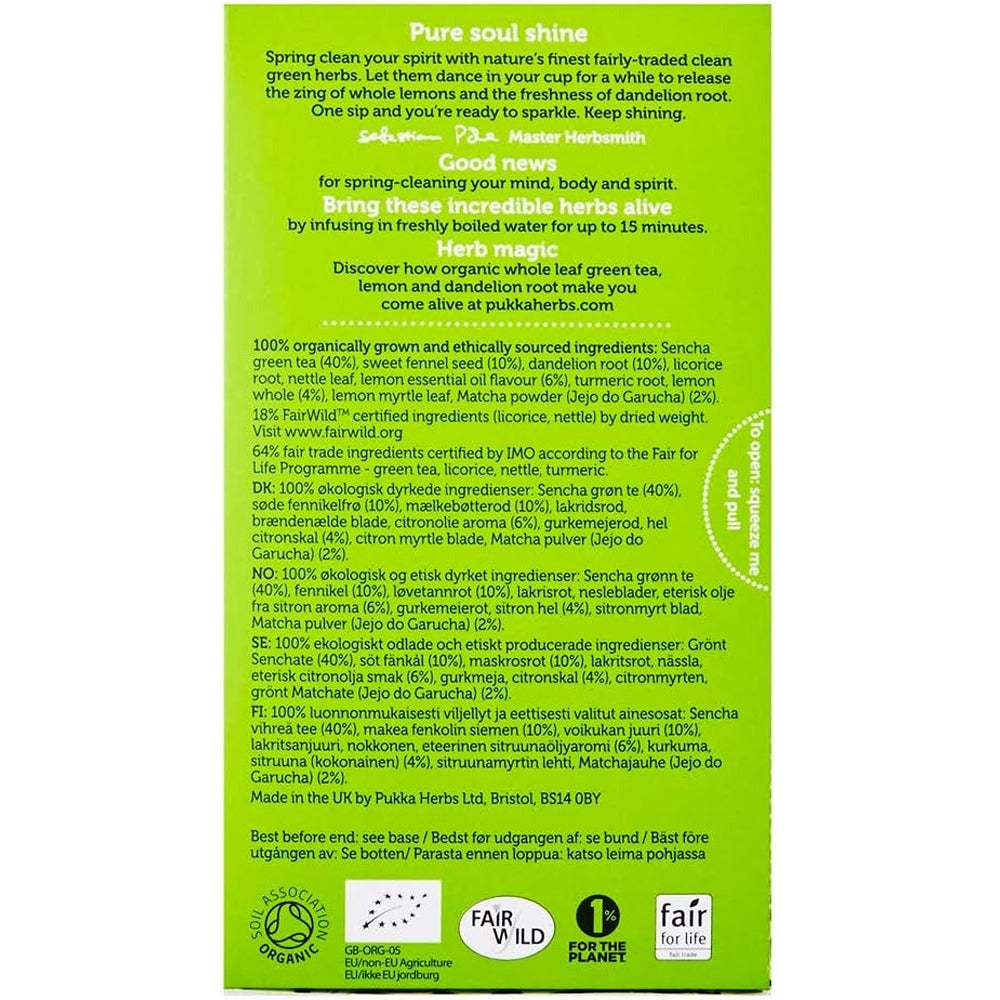 Organic whole leaf green tea with a zing of whole lemons, the cleansing freshness of dandelion root and fennel all lifted by the magical powers of emerald green matcha powder. The organic whole leaf green tea in this blend comes from Vietnam. The ancient trees are climbed by women with great skill. We reward their skill by paying a Fair for Life premium - something common to every Pukka tea.